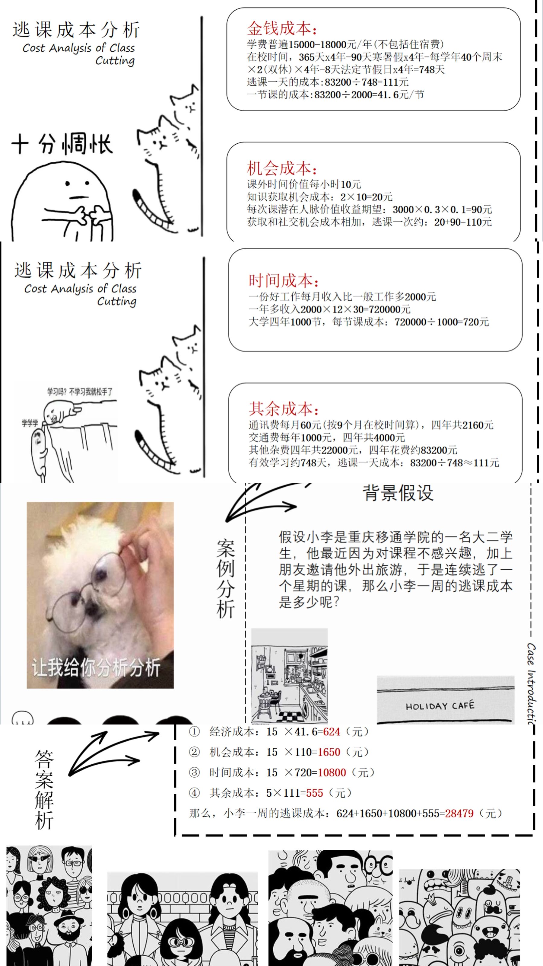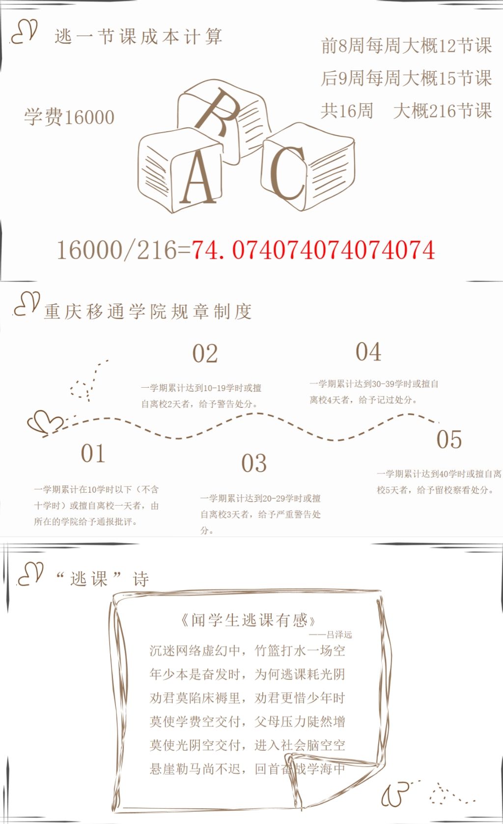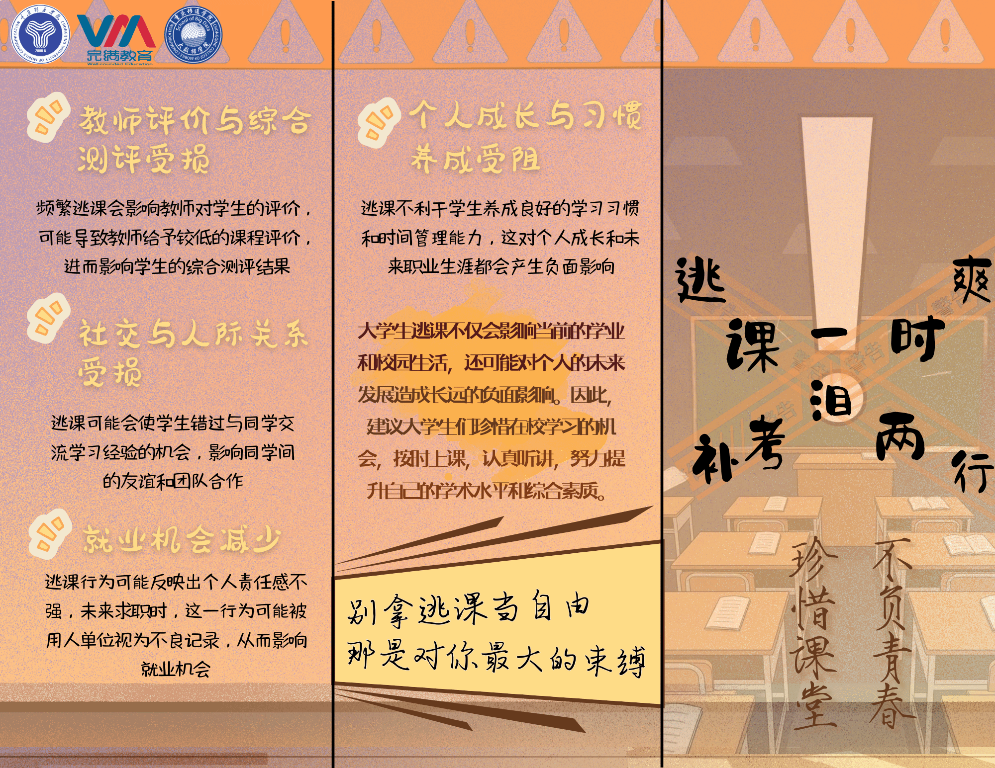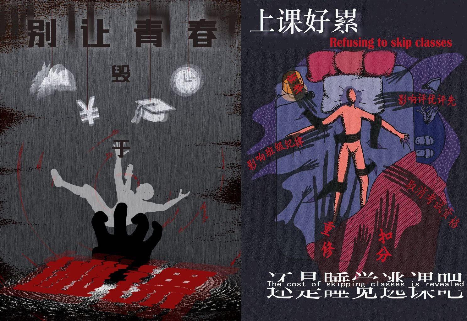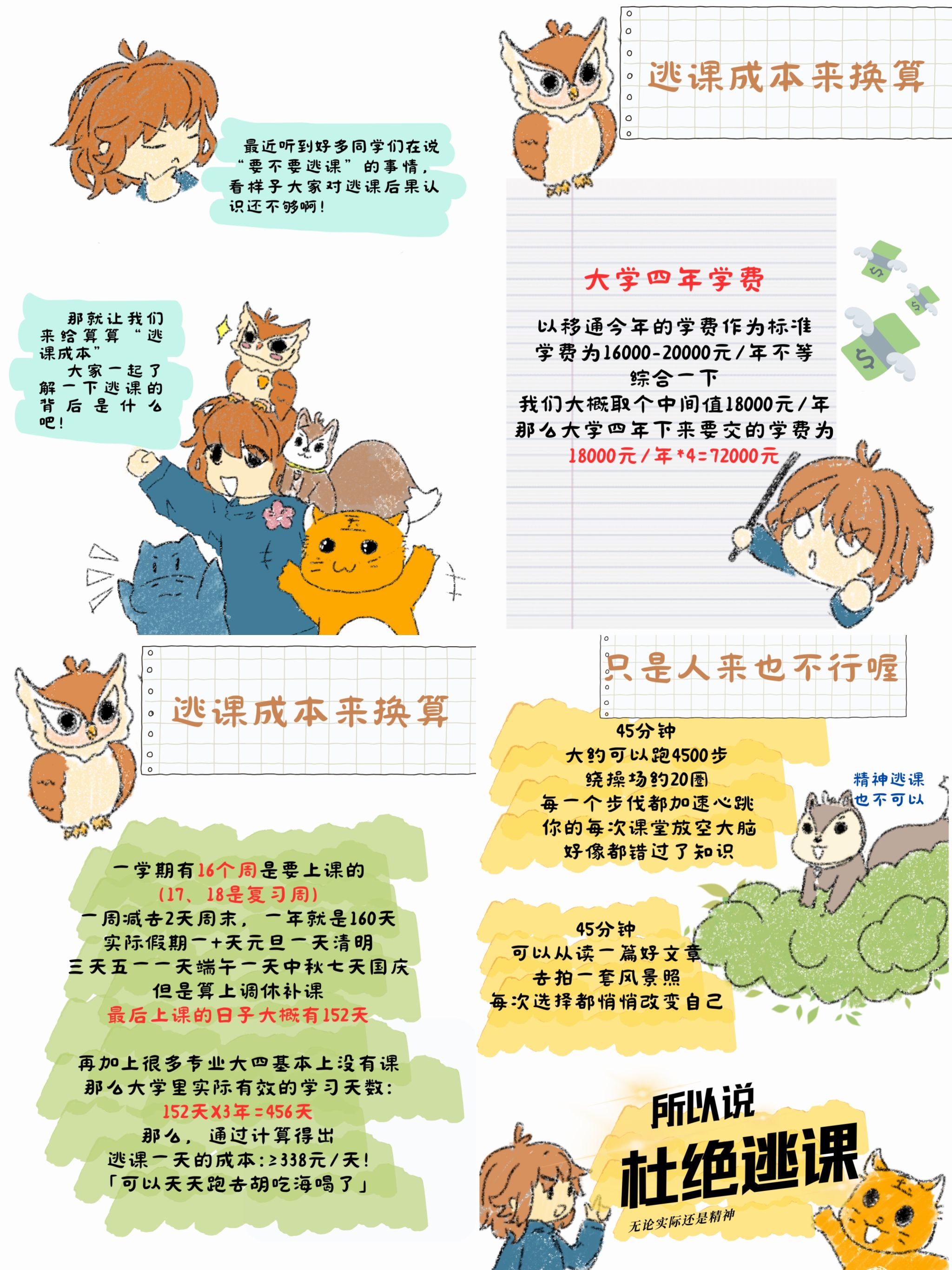 在个人展示环节,选手们对作品见解独到,从个人经历出发,讲述逃课背后的真实故事与深刻反思,以连环漫画、海报等形式,直观展示逃课成本对于学业的负面影响。有的选手以《逃课小账本》的形式展现对于逃课成本的理解,数据化换算逃课的具体成本,以警示其他同学;有的选手将逃课可能带来的影响融入作品,传递出珍惜时光、勤奋学习的正能量。