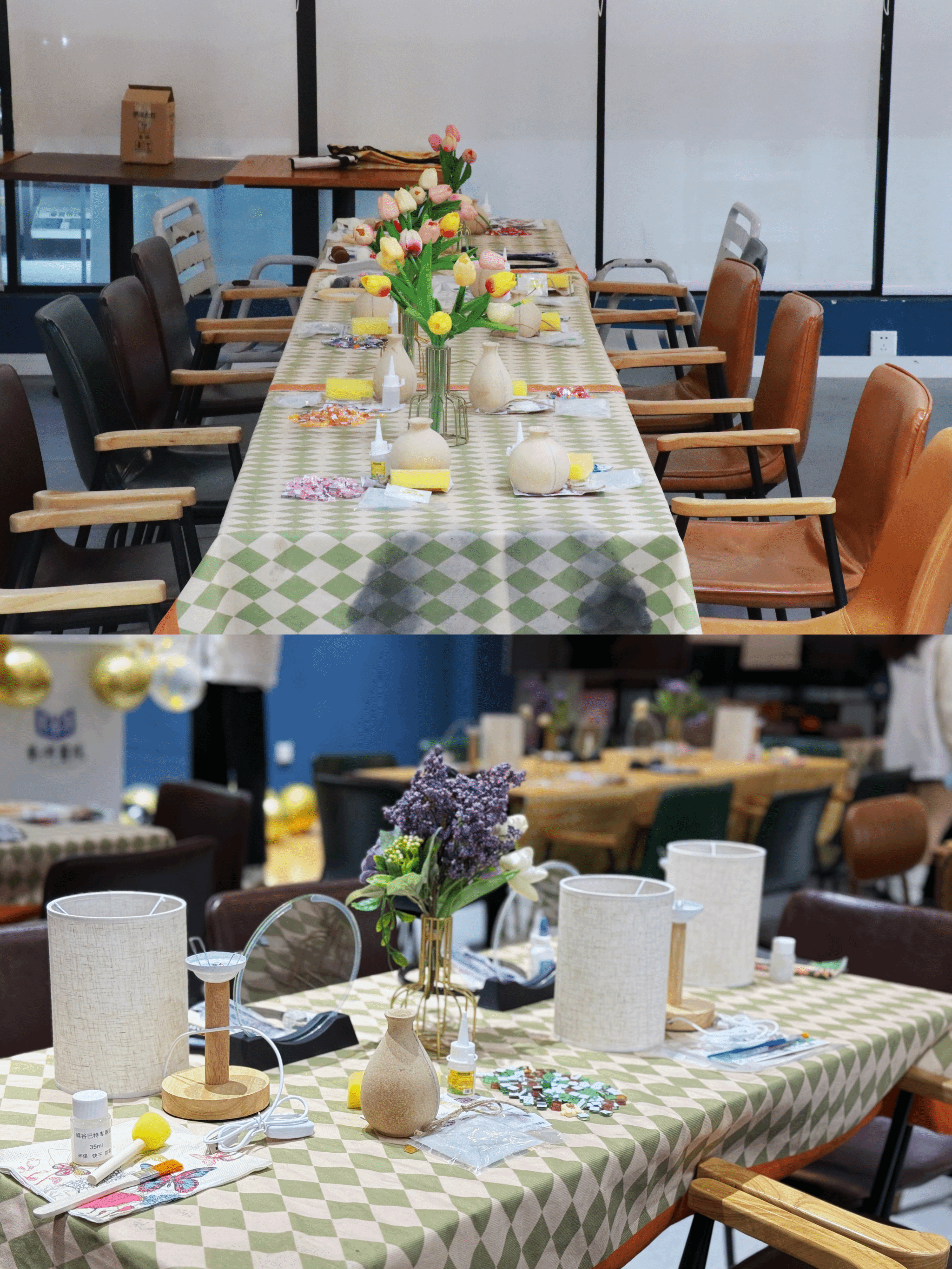 随着活动的深入,现场气氛愈发热烈。手工创作环节成为全场焦点,师生们依据个人兴趣,纷纷围坐在各自的手工台前,投入到干花台灯、戳戳绣、创意流沙画以及马赛克DIY花瓶等丰富多样的手工创作中。