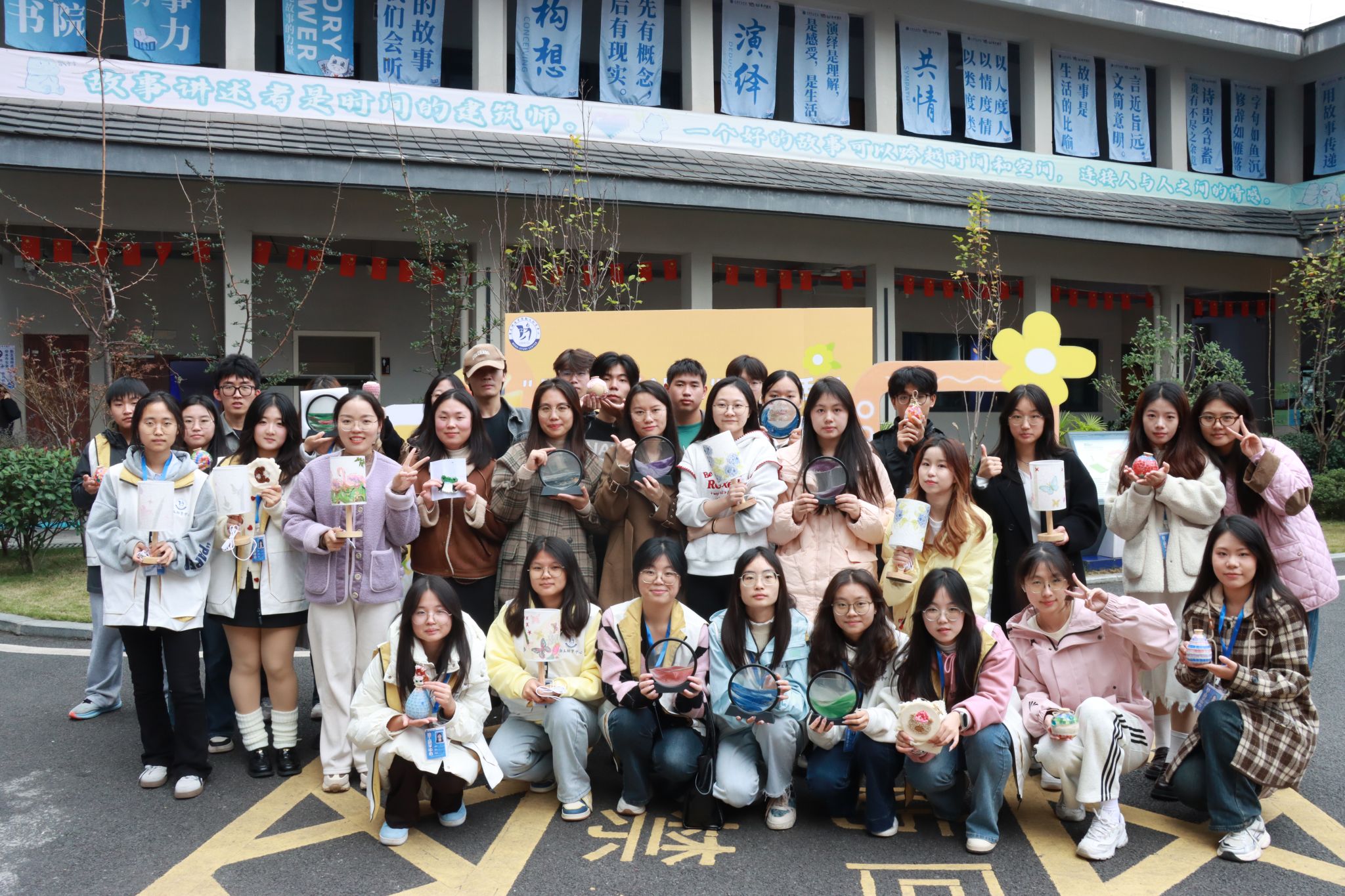 美好的时光总是匆匆流逝,活动在欢声笑语中逐渐接近尾声。全体师生再次相聚,镜头定格下这难忘瞬间:他们手持创意台灯,笑脸在柔和灯光下更显幸福,诉说着活动的温馨点滴;怀抱精美挂件,眼神中满是温柔与关爱;流沙盘作品展现团队智慧与对自然人文的深刻理解;艺术花瓶则见证了师生对美的共同追求。