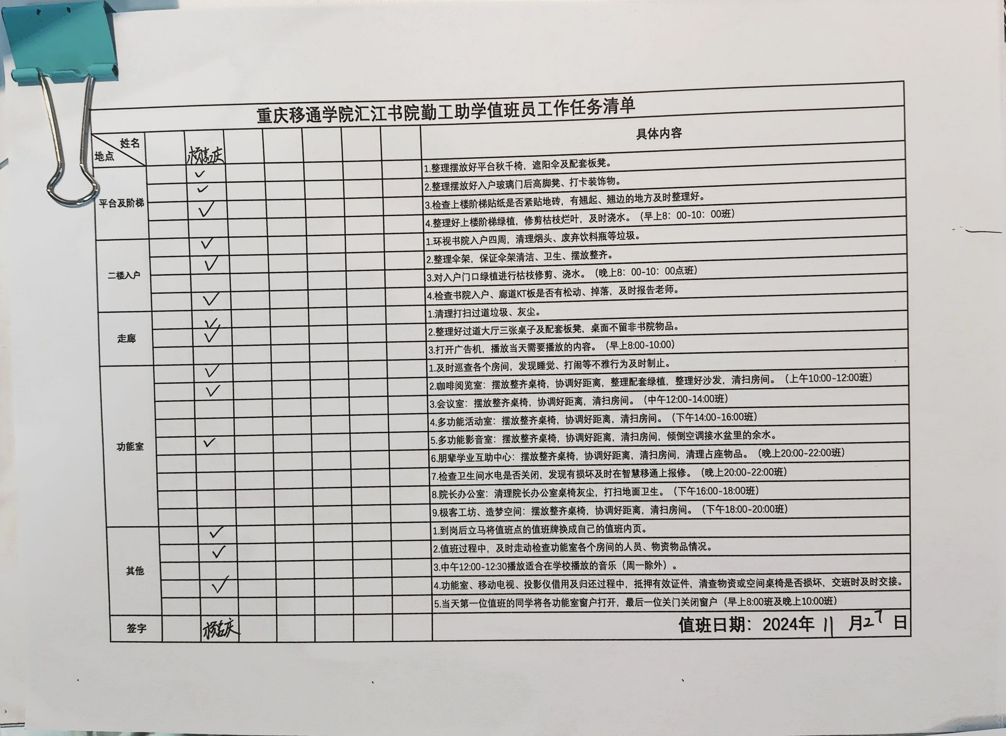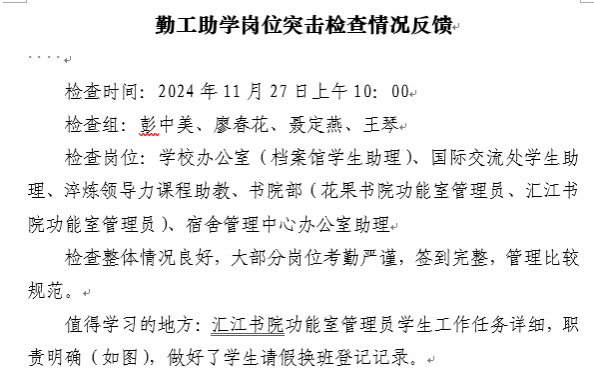 在检查过程中,检查组发现书院部汇江书院功能室管理员管理规范,学生工作任务详细,工作职责明确。但也存在一些问题,如个别岗位学生签字字迹不一、岗位值班安排表未上传学工系统、岗位指导老师未及时签字等。针对这些问题,检查组及时与相关负责人进行了沟通,提出了整改要求,并要求相关负责人立即采取措施进行整改。