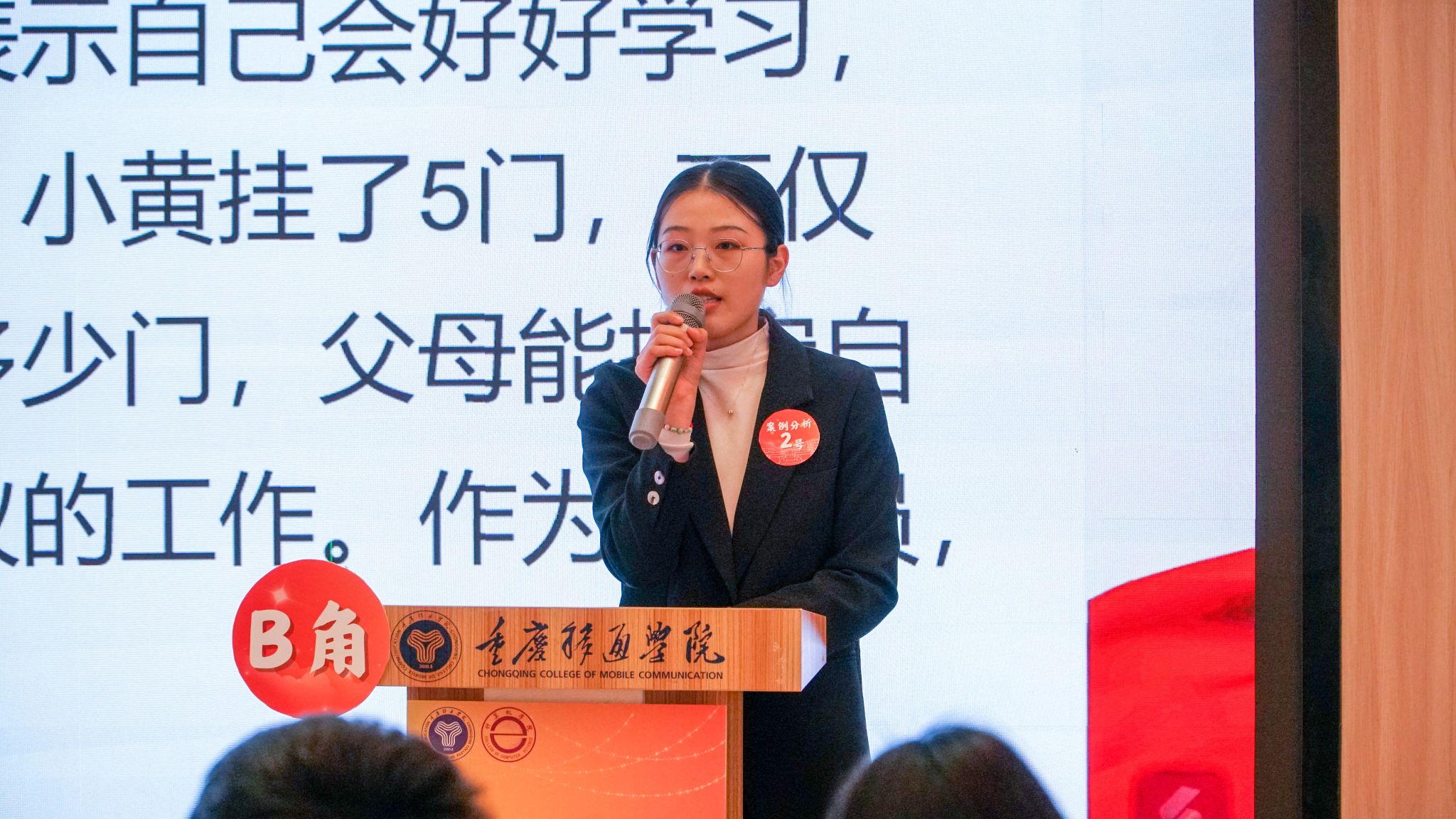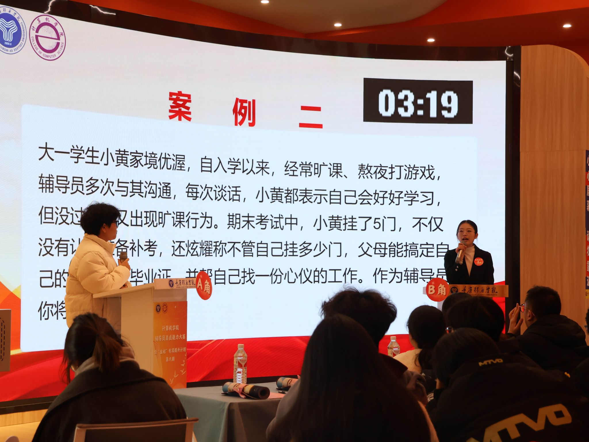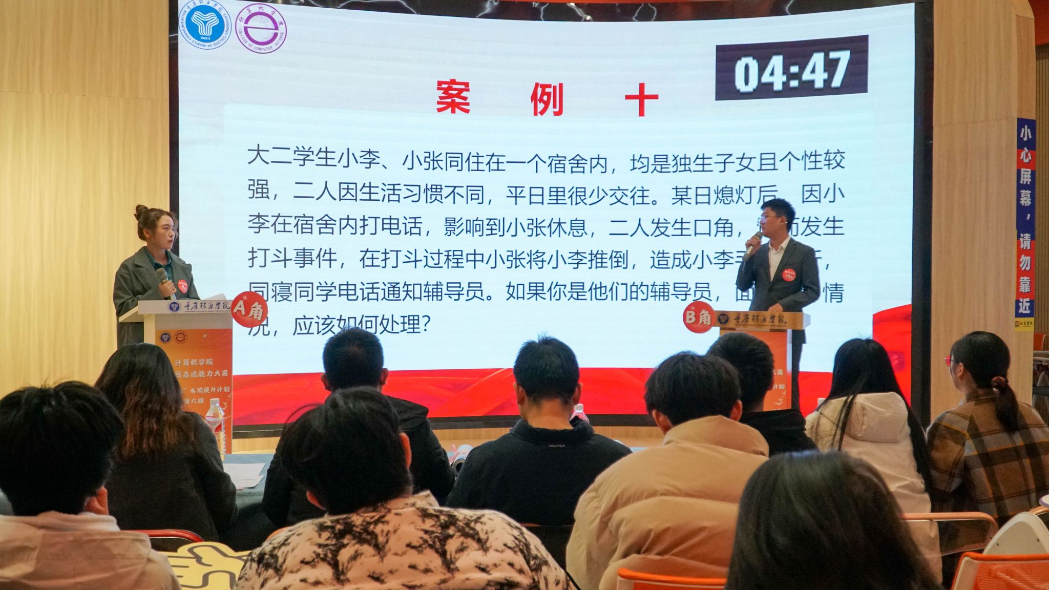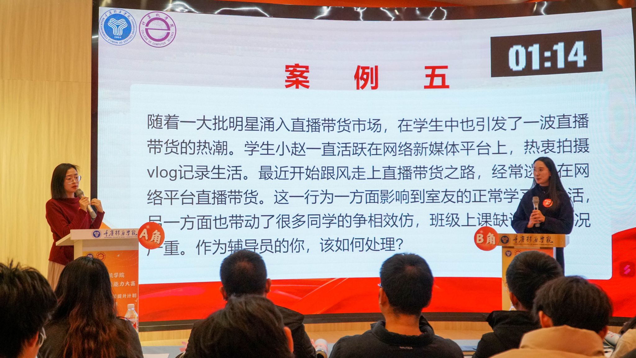 案例分析环节,是对辅导员们应变能力与实战技巧的严峻考验。选手们根据随机抽取的案例,迅速进入角色,以“我提问,你回答”的互动模式,深入剖析问题本质,共同探寻解决之道,提炼经验规律。从诈骗防范的机智应对、权益维护的正义伸张,从生活琐事的细腻处理,到情感纠葛的理性疏导、安全问题的敏锐警觉及心理健康的细致关怀,每一个案例都成为辅导员们智慧与经验的火花碰撞,充分展现了他们处理复杂问题的卓越能力与专业素养,赢得了在场师生的广泛赞誉。
