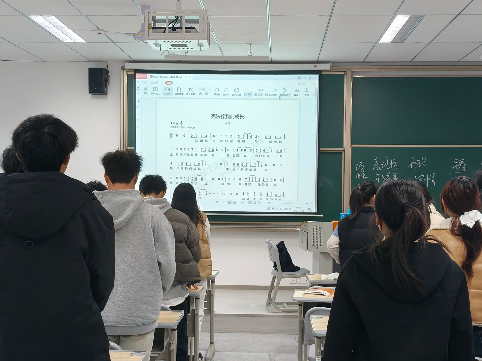 接下来的《宪法伴我们成长》歌曲跟唱环节中,现场气氛热烈,师生跟随主会场的引导,共同用歌声表达了对宪法精神的认同与践行。歌曲旋律悠扬,内容感人,使活动达到了新的高潮。