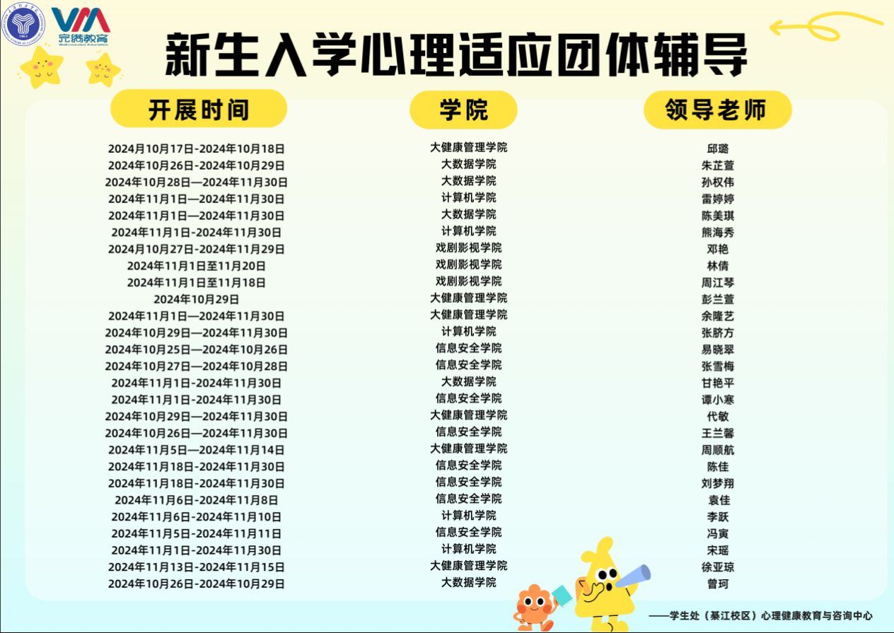 随着新学期的到来,一批新面孔踏入校园。为帮助新生更好地适应新环境,建立积极的人际关系,提升自我管理能力和心理调适能力,各新生辅导员积极响应学校心理健康教育与咨询中心的号召,于2024年10月8日—11月30日,组织开展了113场形式多样、内容丰富的新生入学适应团辅活动,达到新生集体全覆盖。