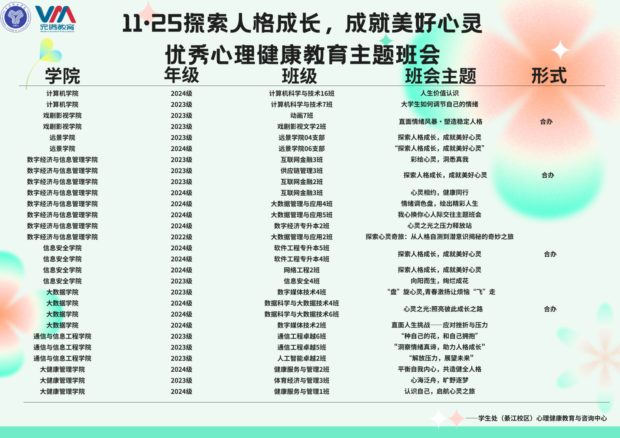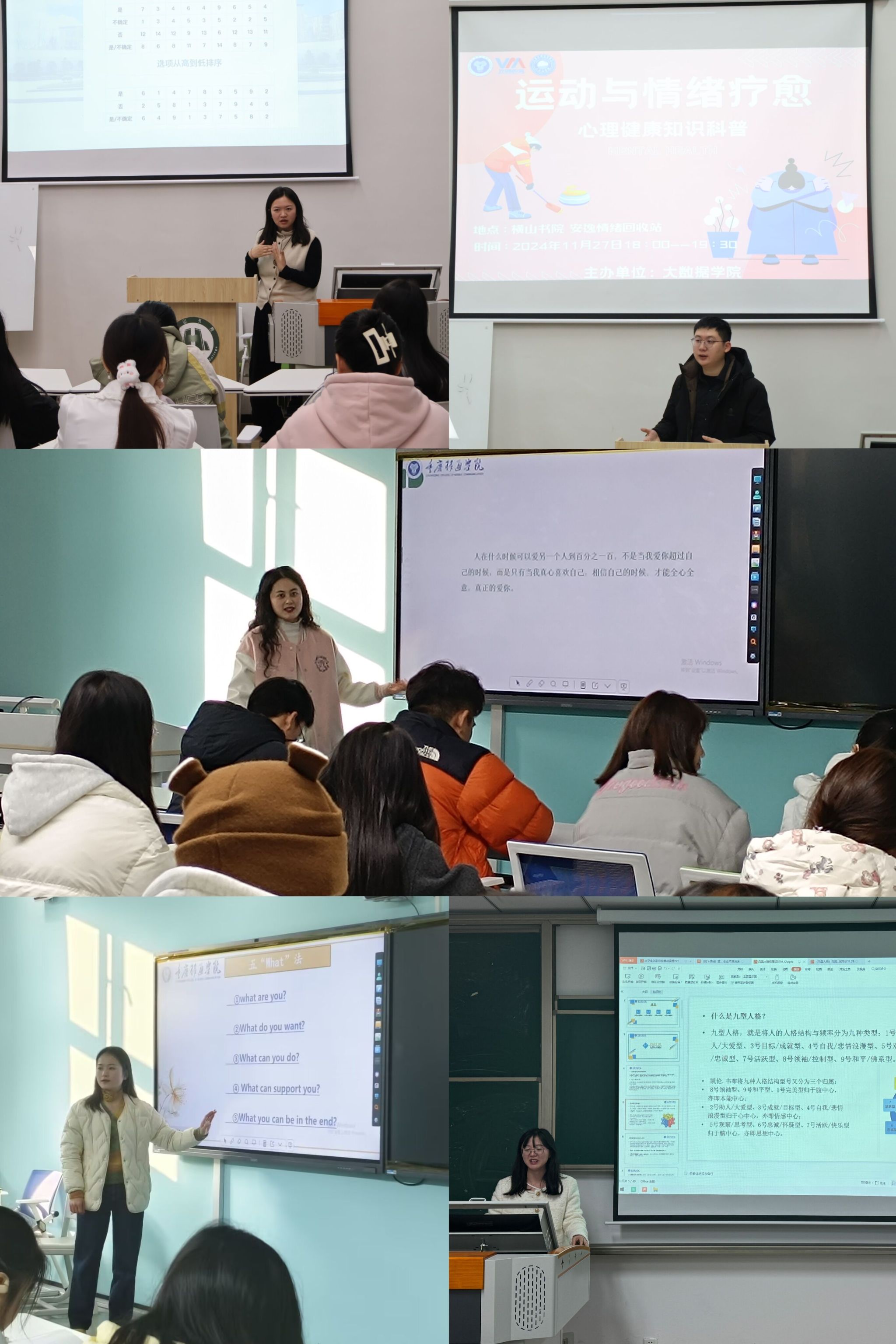 为提高大学生的自我心理调适能力和心理韧性,帮助大学生在体验中认识并完善自我,明确成长方向;提升自我管理能力,养成良好习惯;培养学习能力、思维能力、适应能力等多方面综合素养与积极心理品质。重庆移通学院学生处心理健康教育与咨询中心于11月1日至11月30日期间,对接各个二级学院,举办了共举办157场主题为“探索人格成长,成就美好心灵”的心理班会,9场主题为“塑造健康心灵,拥抱美好未来”的心理健康教育主题讲座,通过形式多样、内容丰富的心理班会与心理讲座,从情绪调适、人际关系、人格成长、生涯规划、运动与情绪疗愈等方面启发学生独立思考,深入探索,在活动中提升智力、思维能力和体质健康水平。