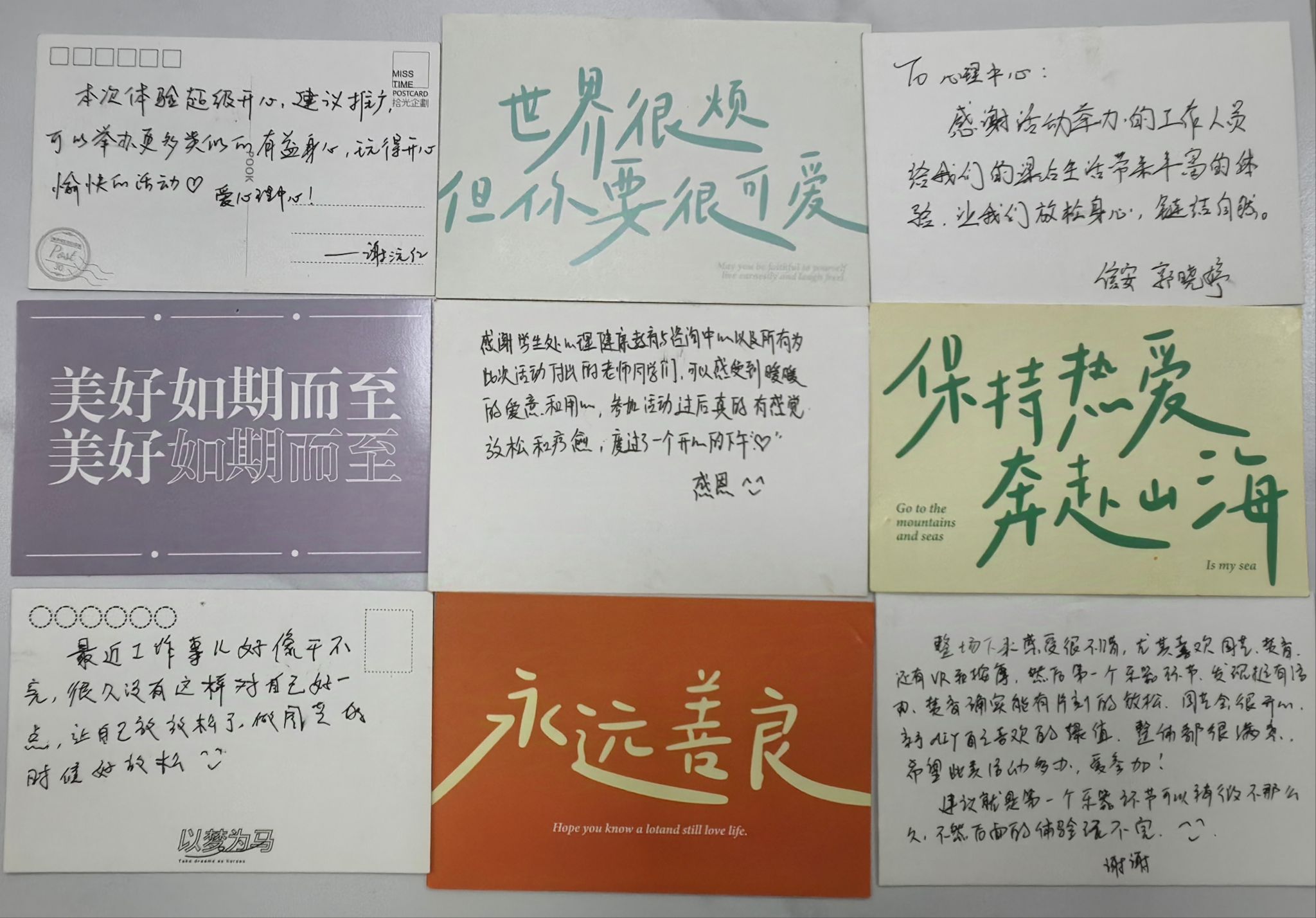 “11.25”心理健康月系列活动坚持“五育并举,健康第一”的教育理念,是普及心理健康知识、培养学生自助助人能力的重要途径。学生们在体验中学习心理知识,展示心理技能;在协作中感受团体力量,体会交友乐趣;在感悟中收获爱与成长,提升自我认知;在课堂外收获生活经验,舒缓心理压力,培养健康的生活方式。心理健康教育与咨询中心将会继续坚持实践活动同心理宣教相结合的方式,面向全校区师生开展形式多样的主题系列活动,不断探索、优化多元有趣的教育形式,通过场地育人与文化育人相结合,提供优质心理服务与心理资源,关注师生心理成长,塑造完满人格,共建美好未来。