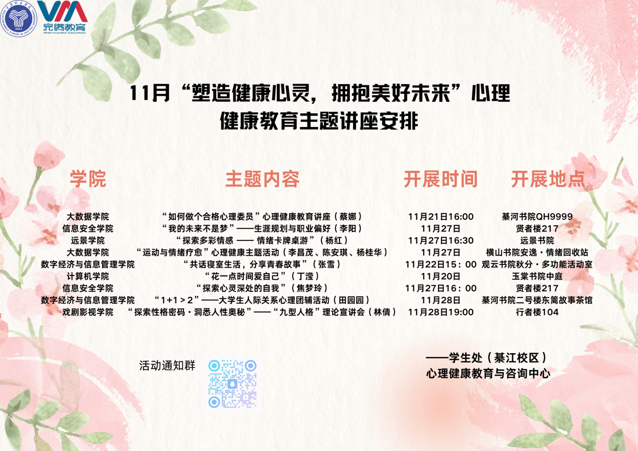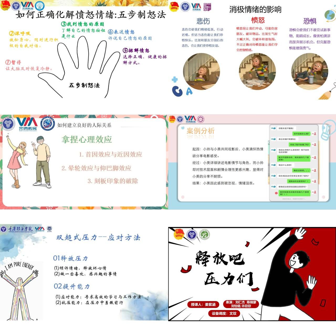 为落实教育部等十七部门关于印发《全面加强和改进新时代学生心理健康工作专项行动计划(2023-2025)》中关于“五育并举”促进学生心理健康的要求,构建积极向上、和谐互助的校园心理文化氛围,重庆移通学院于2024年11月1日—11月30日举办了“11.25”心理健康月系列活动。本次活动以情绪管理为主题,依托色彩心理学,包含了“以德育心”“以智慧心”“以美润心”“以体强心”“以劳健心”五大主题活动,通过启动仪式、教师积极心理体验、心理微课、心理班会、心理讲座、志愿服务等活动内容,呼吁大学生重视情绪管理,提升其幸福感,培养积极心理品质,促进完满人格成长。