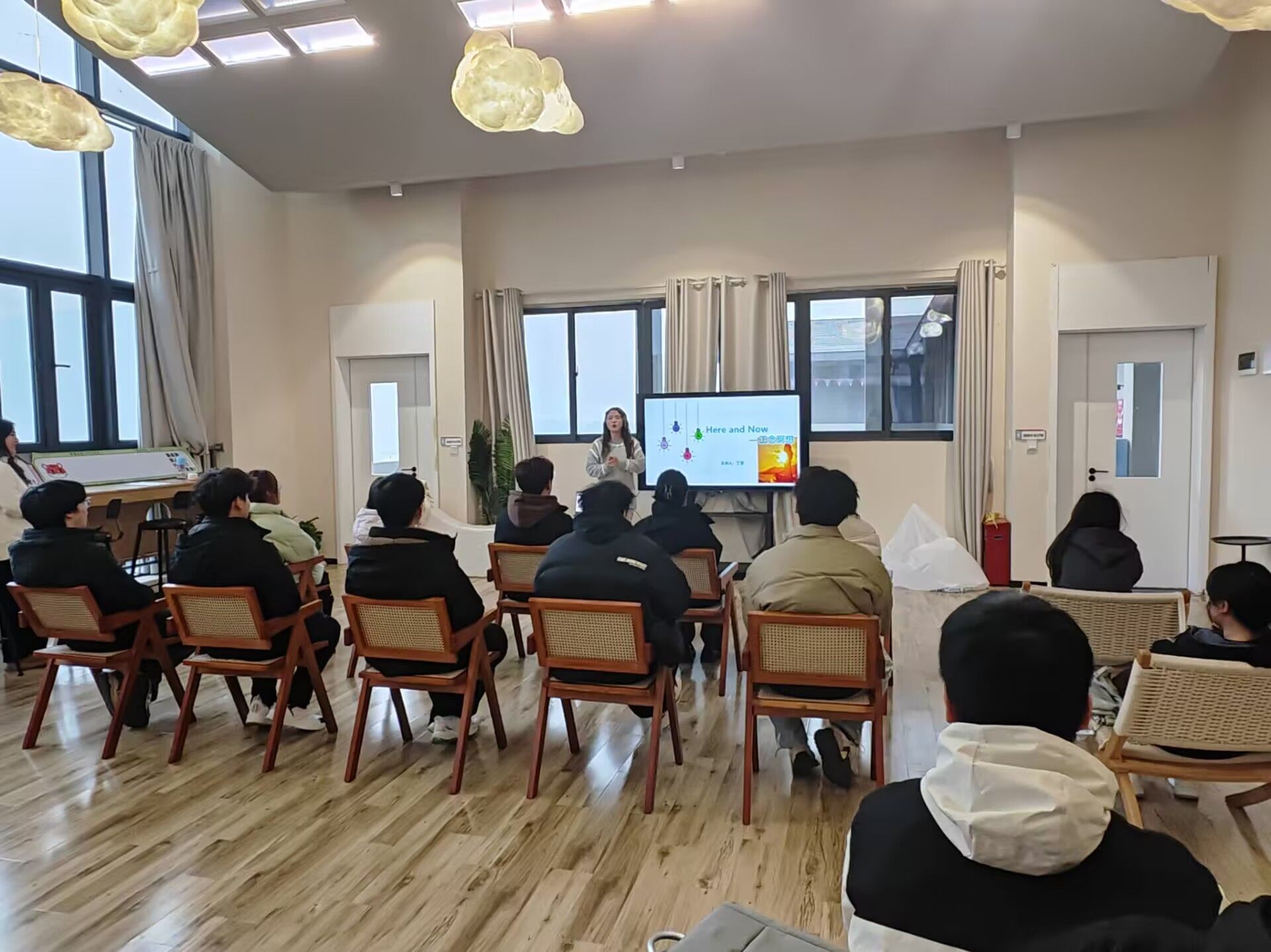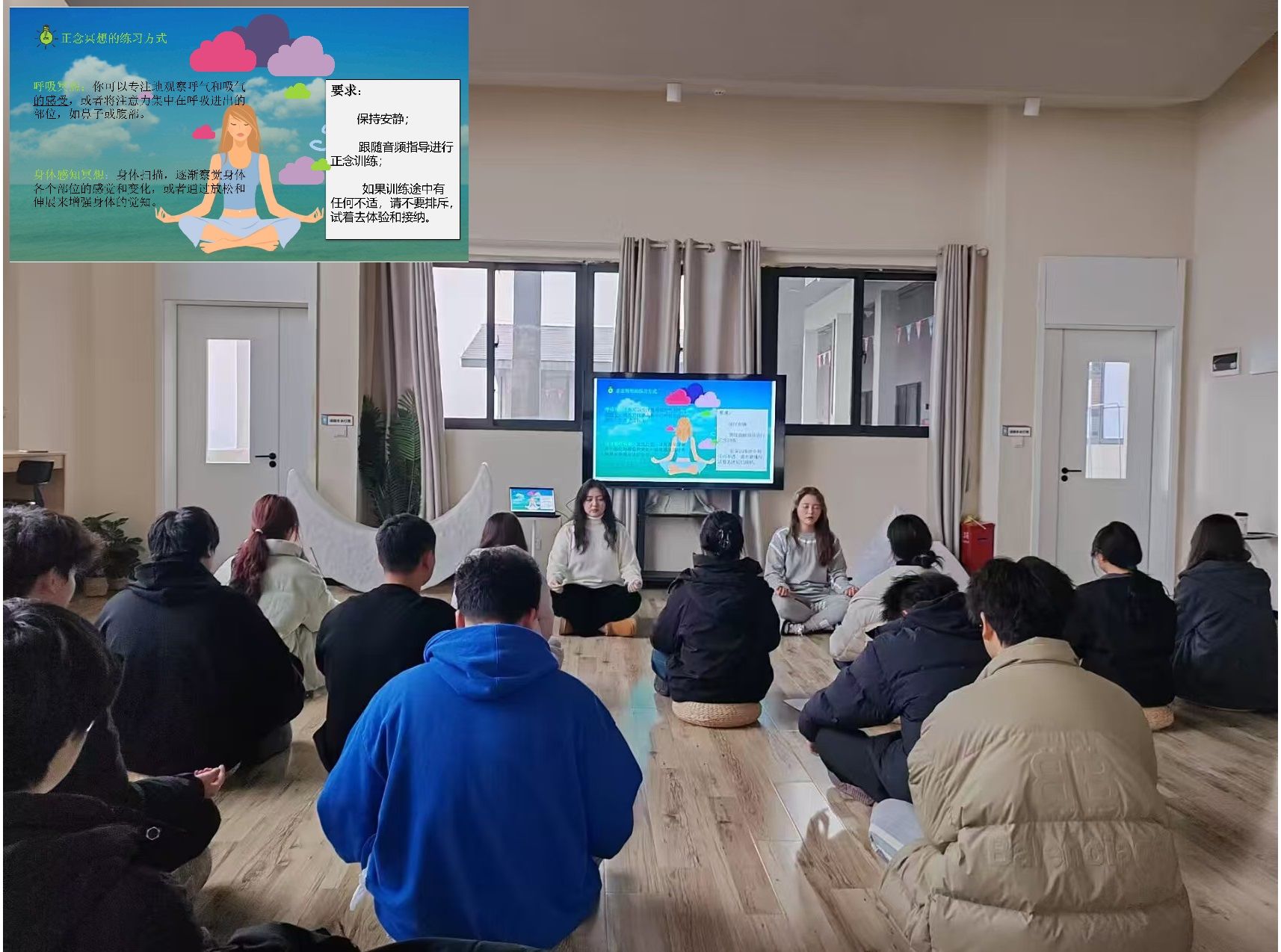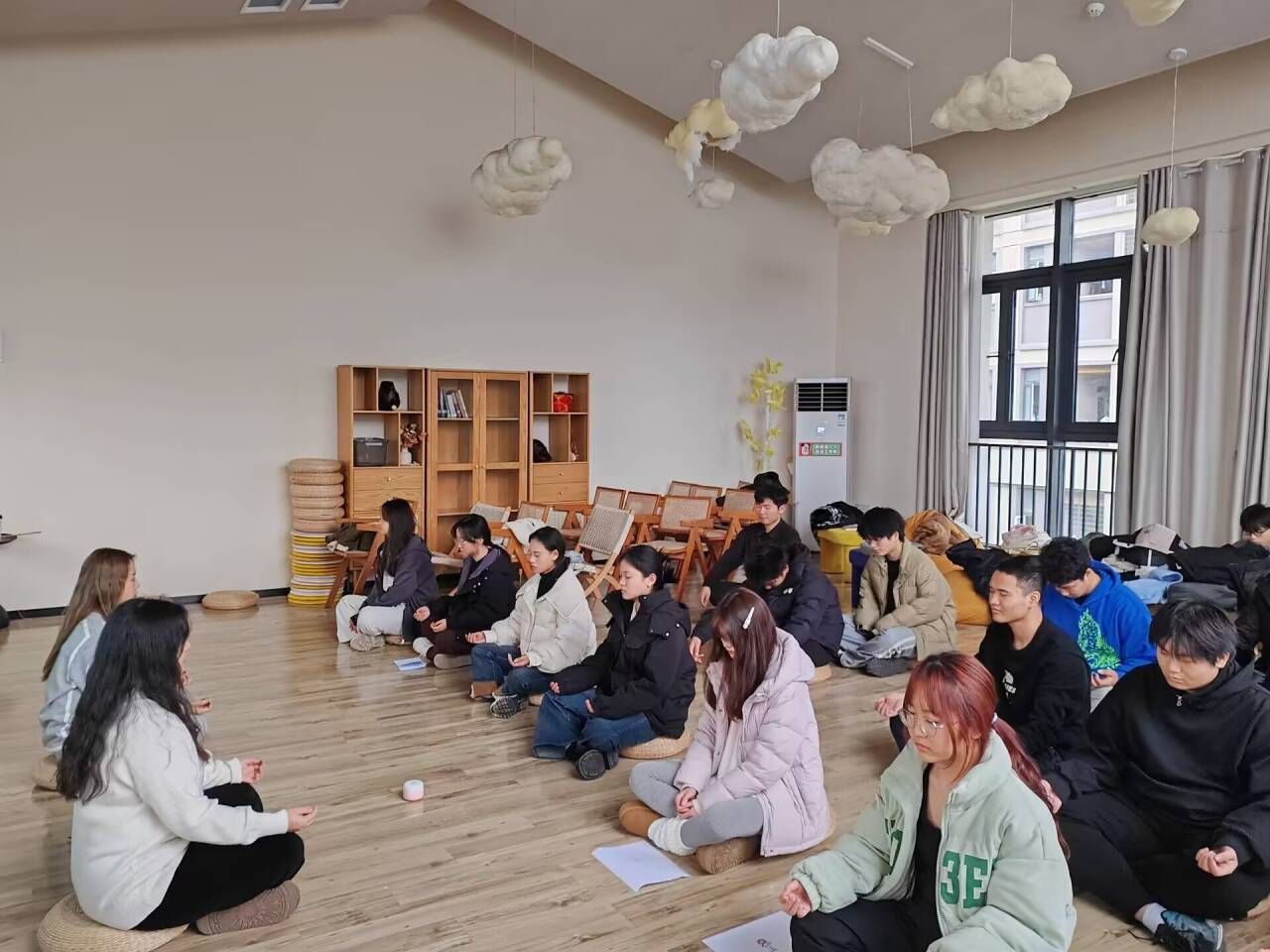 在当下这个快速变迁、竞争白热化的时代,大学生正面临着前所未有的学业、就业及日常生活的重重压力。焦虑、抑郁等心理问题在学生群体中愈发普遍,成为不容忽视的社会现象。值此期末复习考试的重要节点,为有效缓解学生们的心理压力,帮助他们以更加积极的心态面对考试和未来的挑战,计算机学院心理专项老师丁滢老师于12月11日16点在玉棠书院云里发呆室,成功举办一场面向计算机学院2024级普本心理委员的正念冥想活动。