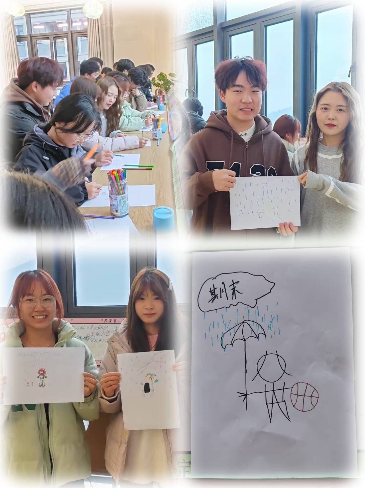 活动伊始,丁滢老师巧妙地引出本次活动的首个环节——“雨中人”测试,邀请同学们以简单的线条和色彩,在空白的画纸上勾勒出自己对“雨中人”的独特理解。在雨中人画作中,雨的大小表示压力的大小,而雨滴落的方向则表示压力的来源。每一个标志物都有其独特的象征含义。
