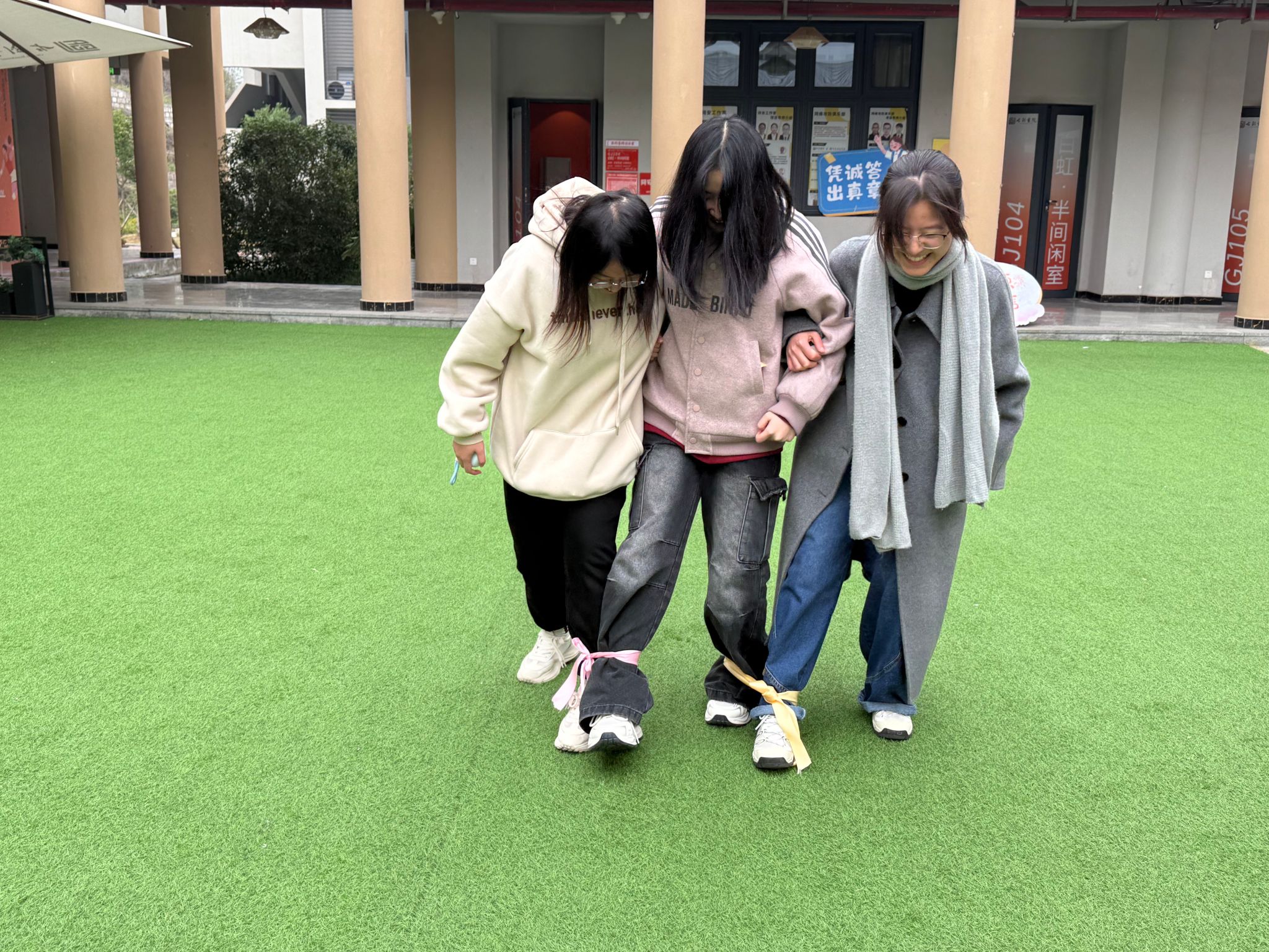 草坪上,三人四足比赛正热火朝天地进行。参与者三人一组,肩并肩站成一排,丝带将相邻两人的左右脚紧密地绑在一起。随着口令的下达,各组仿佛离弦之箭般疾速冲出起跑线。队员们肩并肩,手臂相搭,身体微微前倾,目光坚定地锁定前方的目标。有的队伍步伐一致,口号响亮;有的虽初显慌乱,但迅速调整节奏,携手共进。