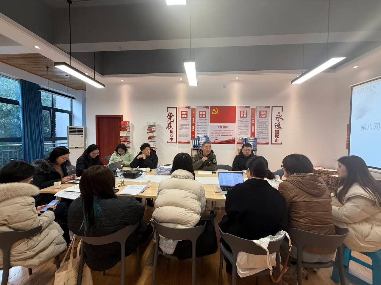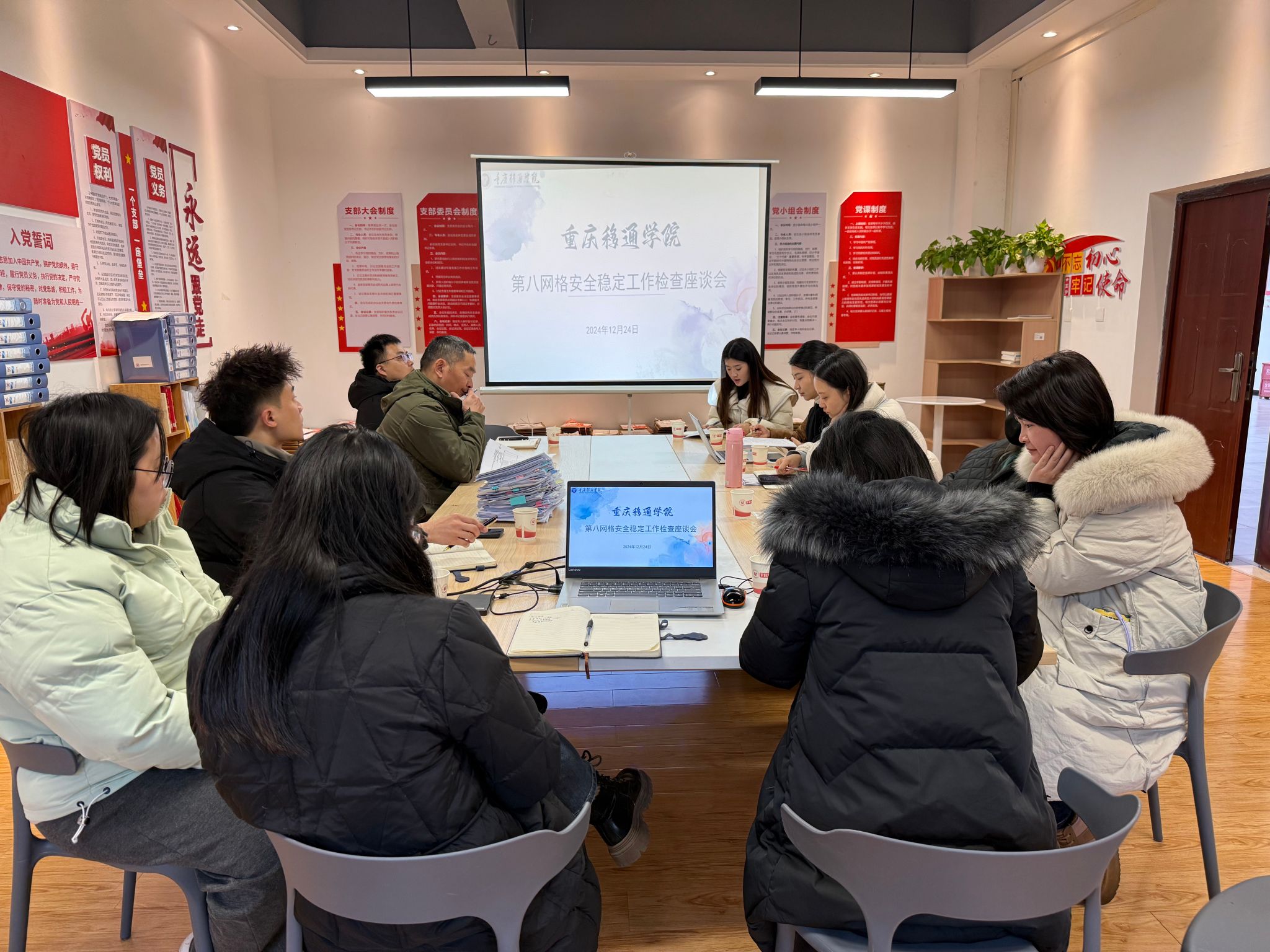 2024 年 12 月 24 重庆移通学院安全稳定第八网格以“做好安全稳定工作,筑牢完满教育之基”为主题的安全稳定工作检查座谈会在第五教学楼淬炼商学院党员活动室召开。本次座谈会由淬炼商学院学工办主任廖进主持,保卫处处长彭洪,学生处代表吴雷方成,人力资源处代表王吉玲,新闻宣传中心代表喻洁,以及第八网格负责人和联络员共同参加,旨在回顾本学期安全稳定第八网格工作的开展情况及检查安全稳定台账材料,以总结经验更好地推进安全稳定工作开展。