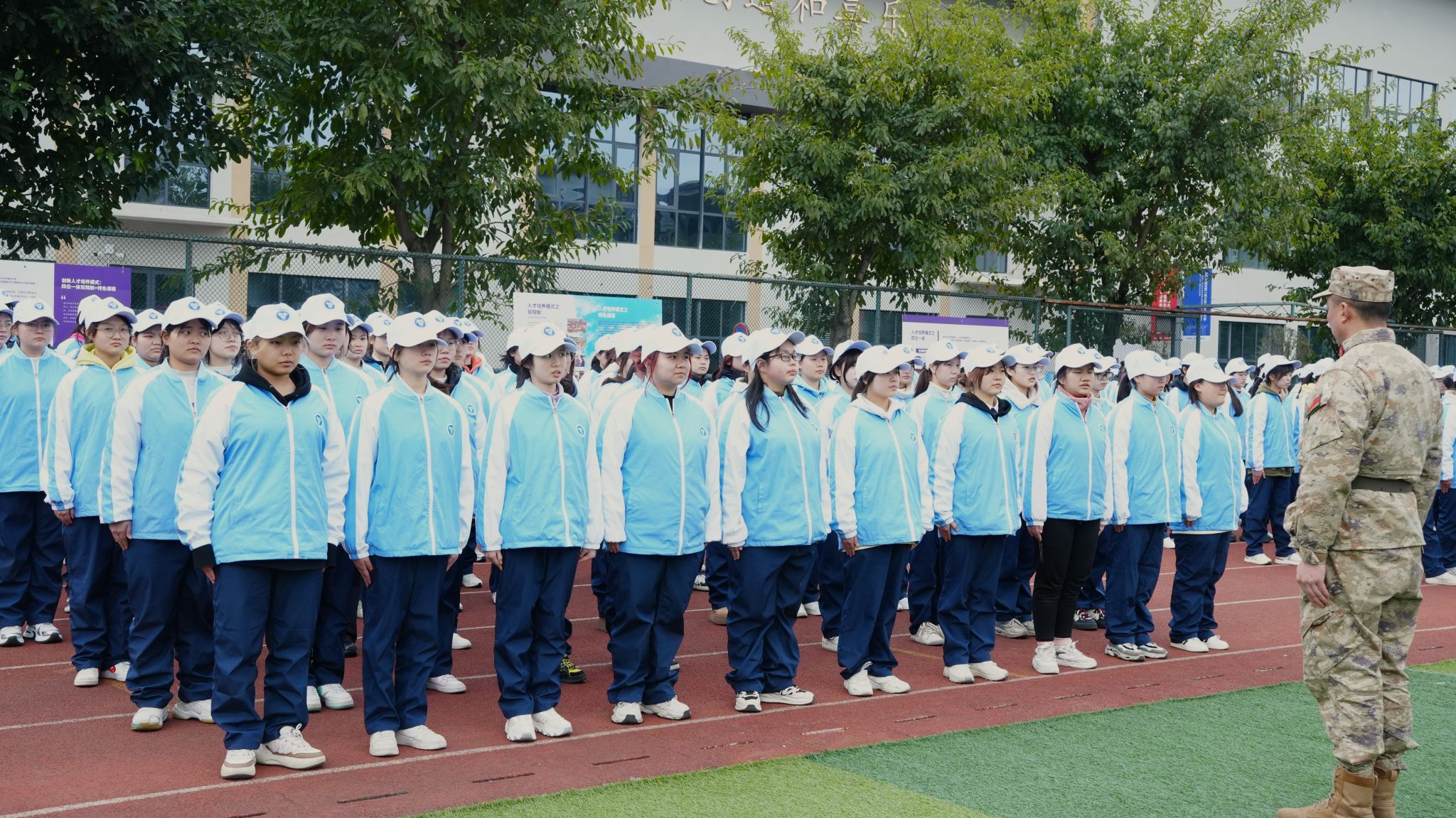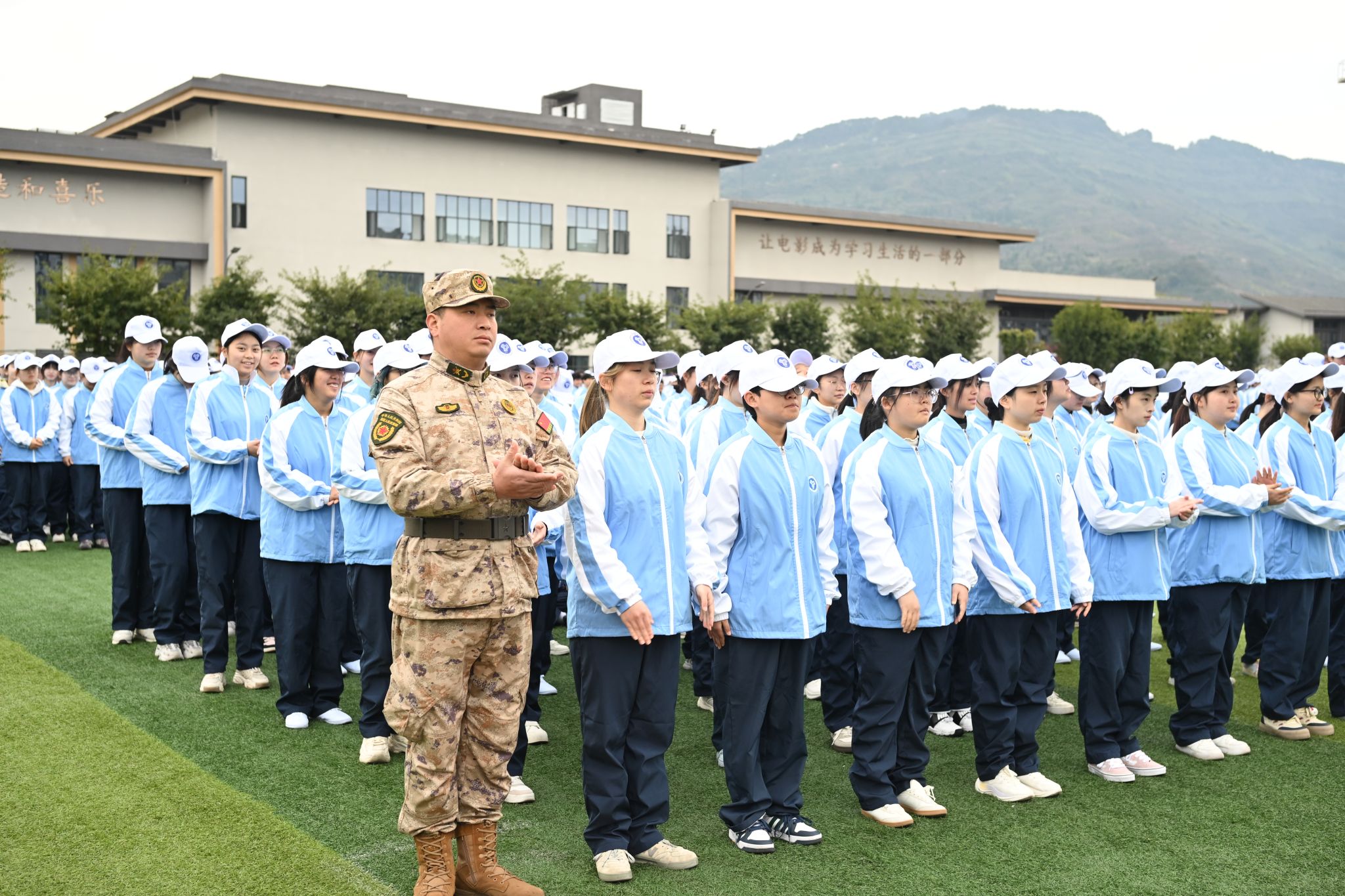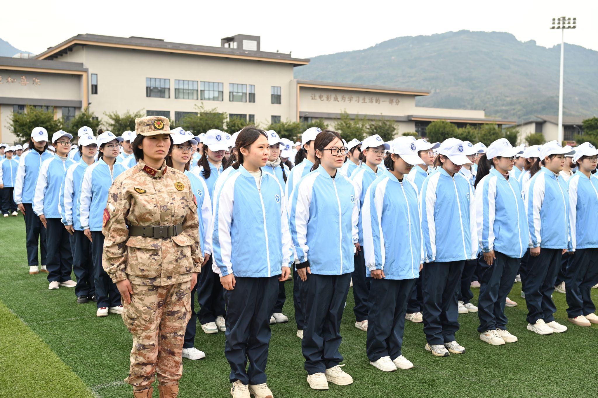 操场上,戏娃们仰首伸眉,雄姿英发,认真接受着教官的指导、监督与训练。同时也向教官展示他们的学习成果:立正、稍息、停止间转法、齐步走……随之望去,步伐一致,整齐有序。随着时间流逝,戏娃们的内心已然浓烈炽热,团队精神如炬,信念如磐。在即将结束操练之时,戏影连队的风采如圭如璋,每个人都在严苛的训练中实现了自我超越,完成了首次蜕变。