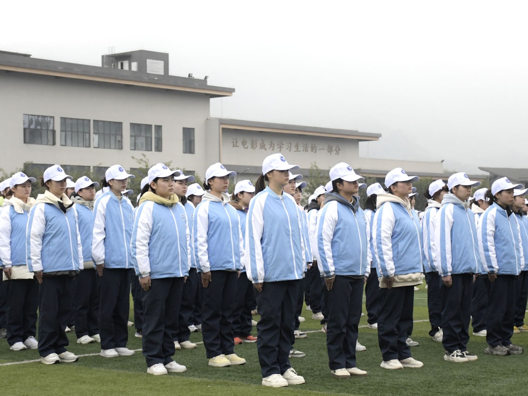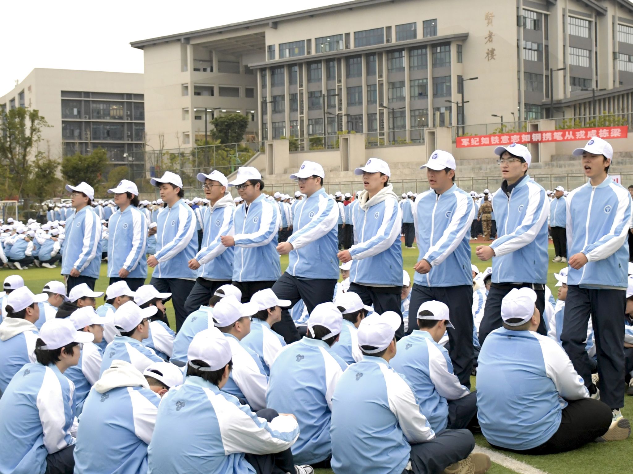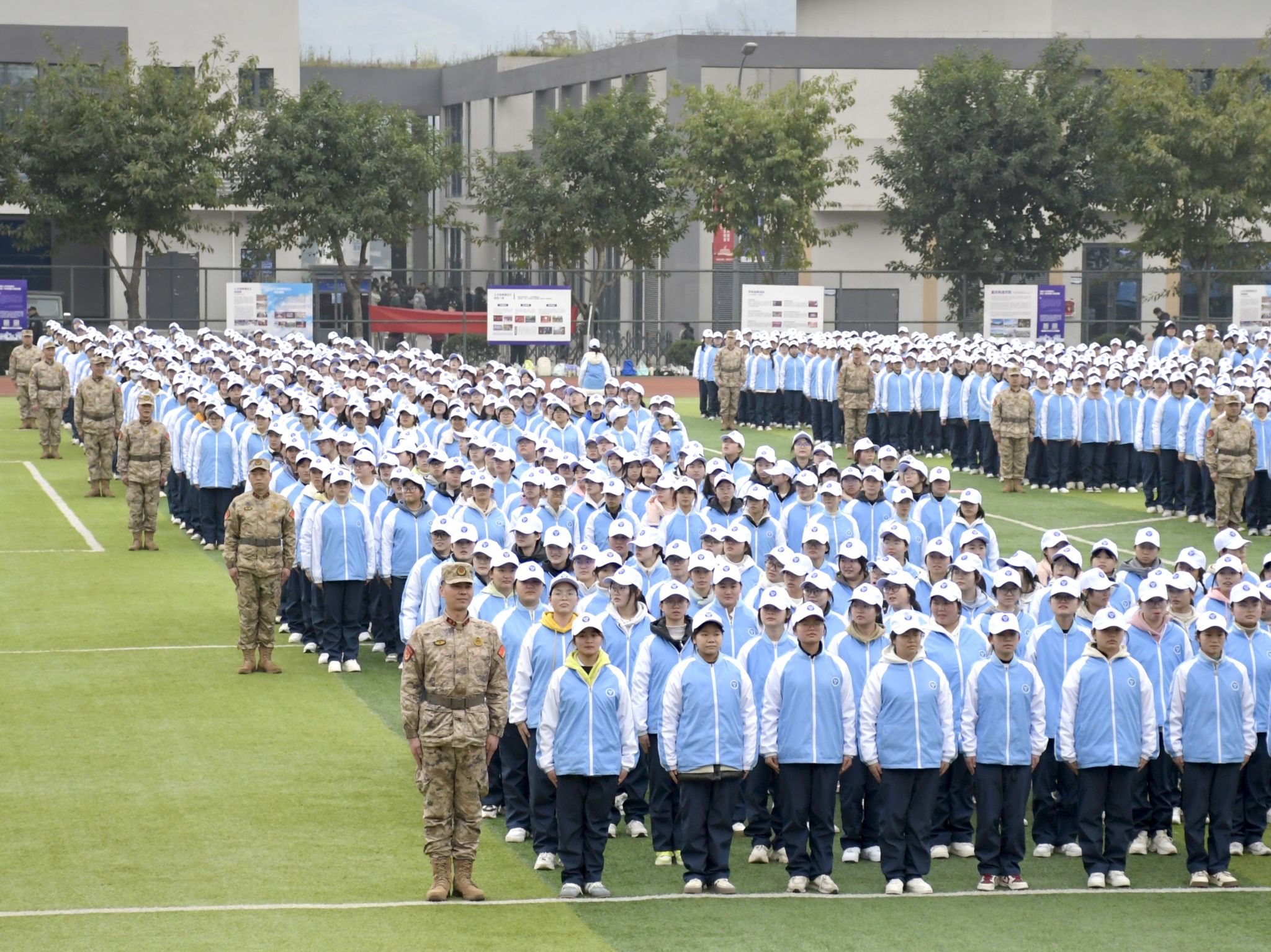 蓝领白帽笔直站,军训画卷展新颜