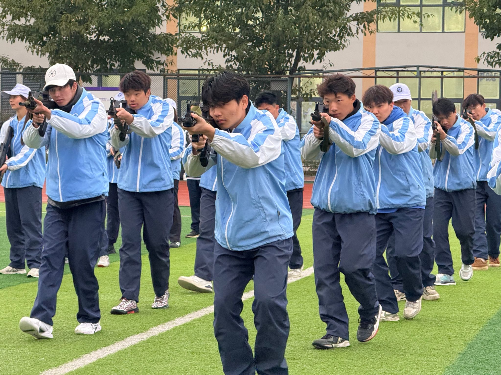 15:40-17:00,操场上出现了一道亮丽的风景线。战术方阵的同学们或双手紧握模拟枪支,眼睛透过瞄准镜锁定目标;或身体紧贴地面,向前匍匐前进。训练动作一气呵成、利落帅气。