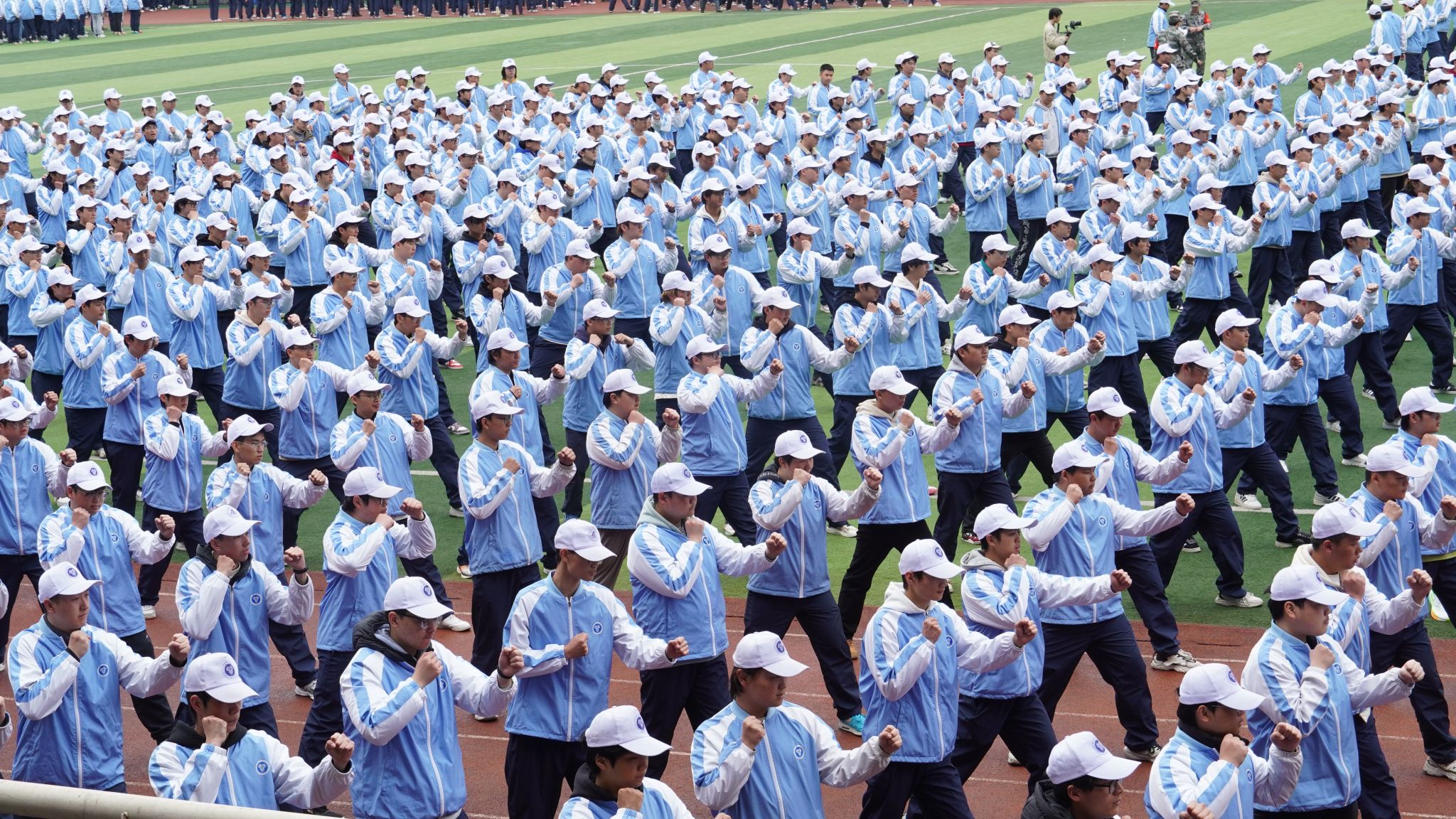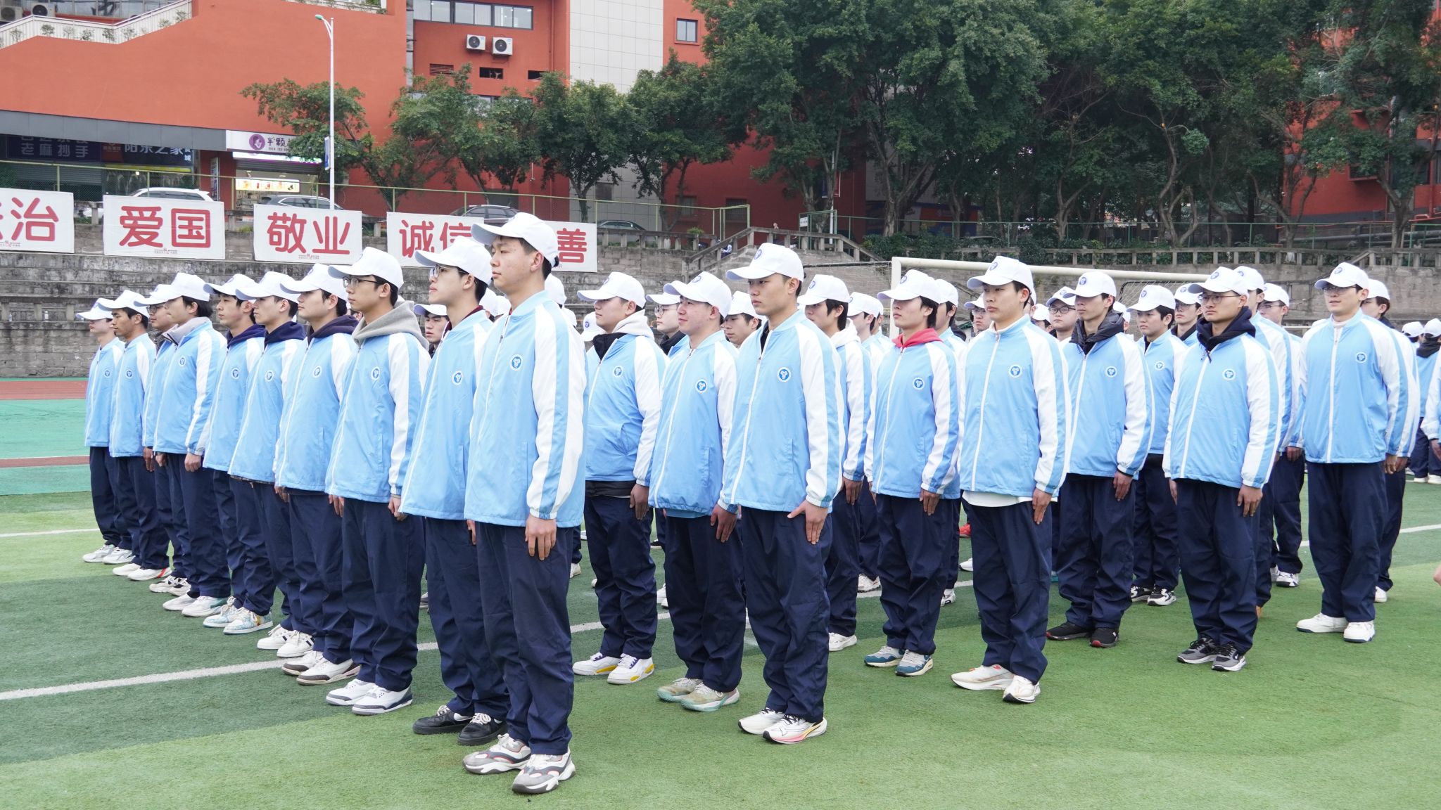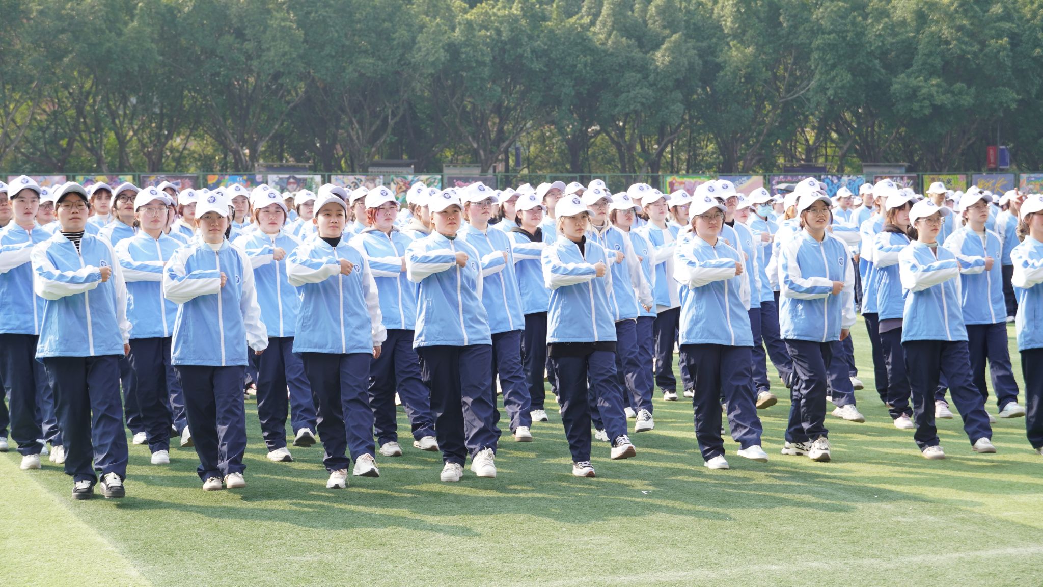 日中 15℃,晴空万里,红日高悬。绿茵场上展英姿,训练场上热血燃。阳光少年踏正步,口号铮铮震云天。