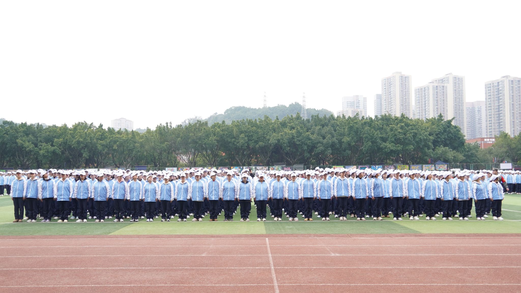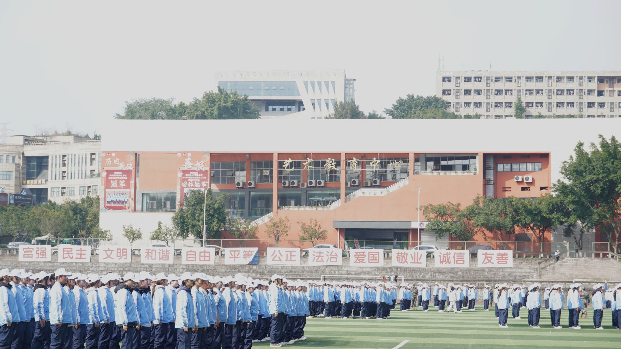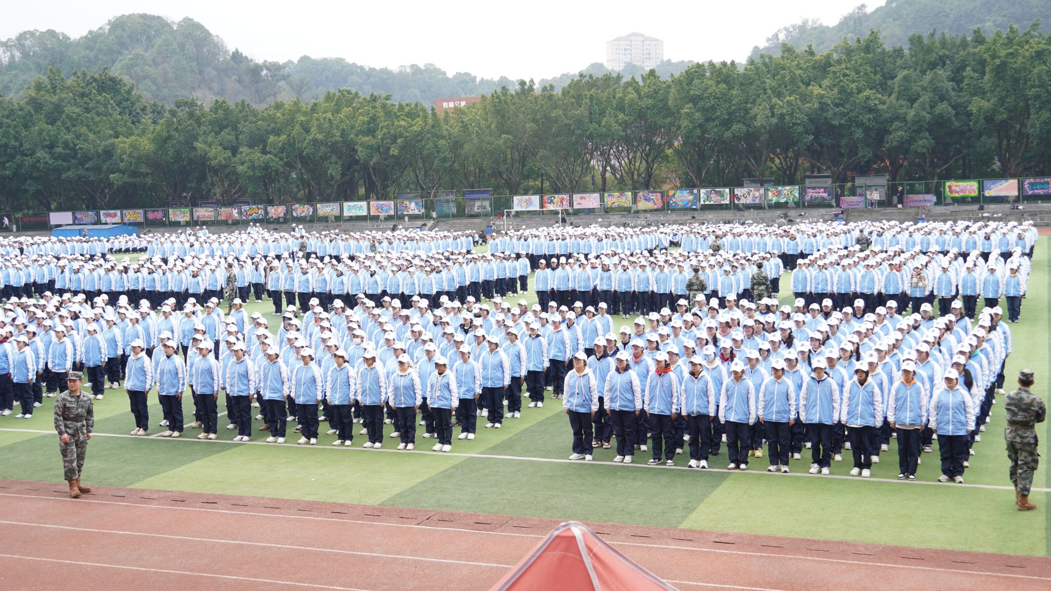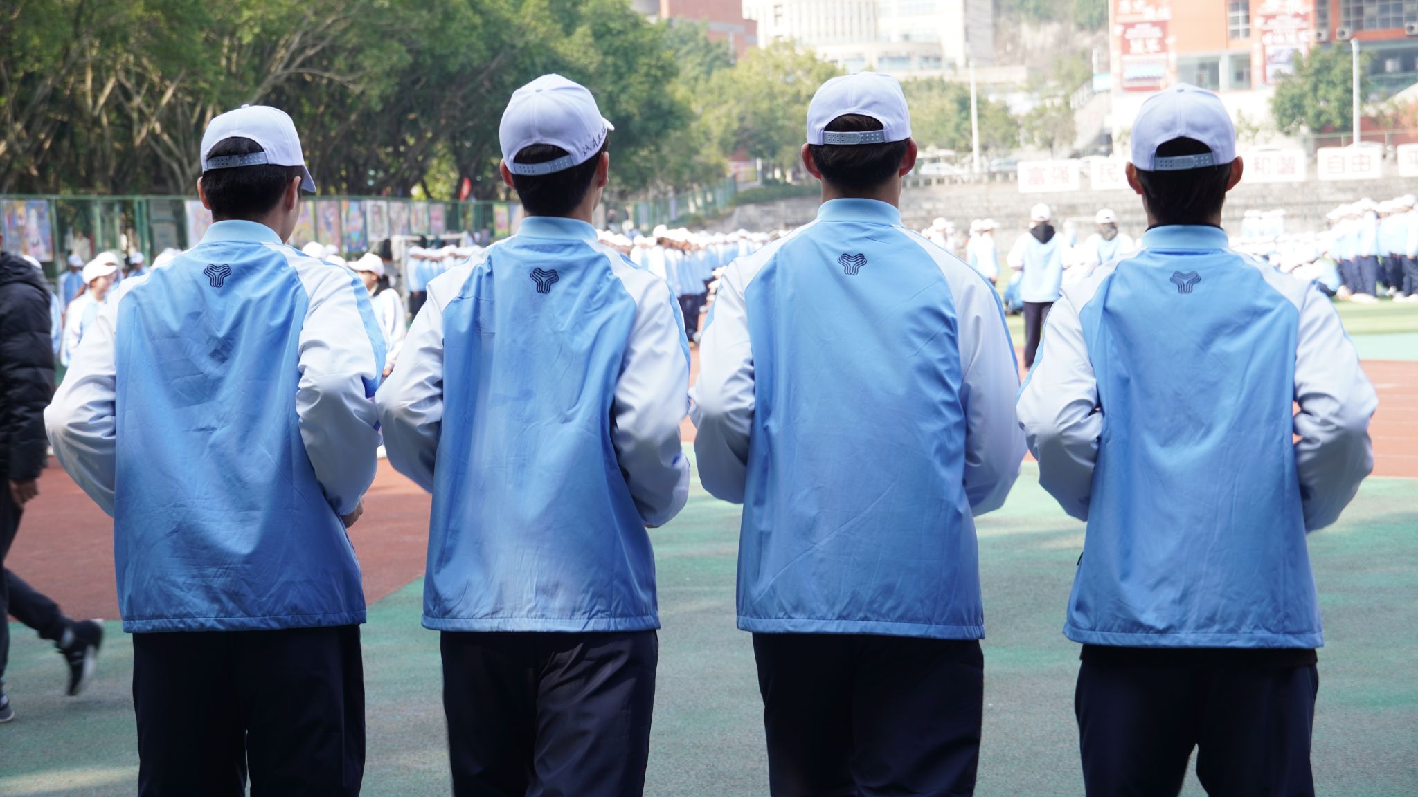 日中 15℃,晴空万里,红日高悬。绿茵场上展英姿,训练场上热血燃。阳光少年踏正步,口号铮铮震云天。