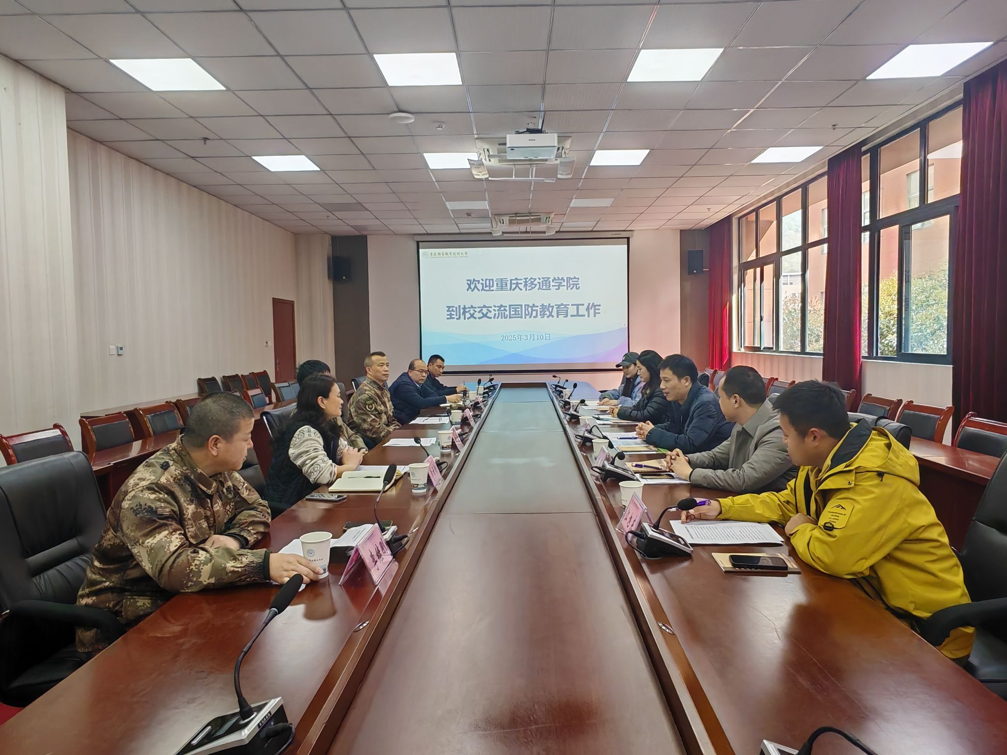 为深化国防教育实践创新,探索高素质军事人才培养模式,3月10日,重庆移通学院学生处处长陈帅带队赴重庆机电职业技术大学开展专题交流学习。双方围绕国防教育体系建设、军士生培养管理及征兵工作提质增效等议题展开深度探讨,重庆机电职业技术大学副校长何超、学生处处长李云杨、军士生学院院长陈飞,党总支副书记李继刚等人全程参与,通过实地考察与座谈交流共绘育人蓝图。