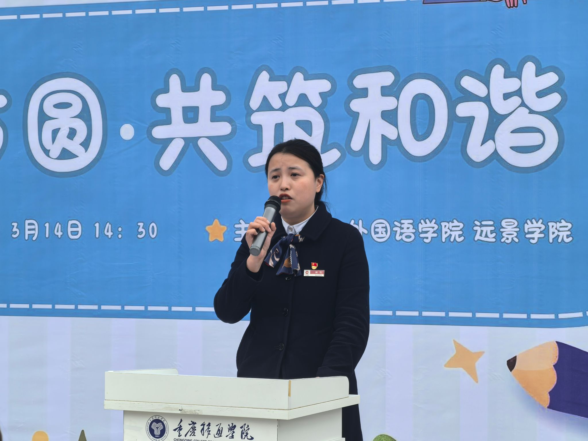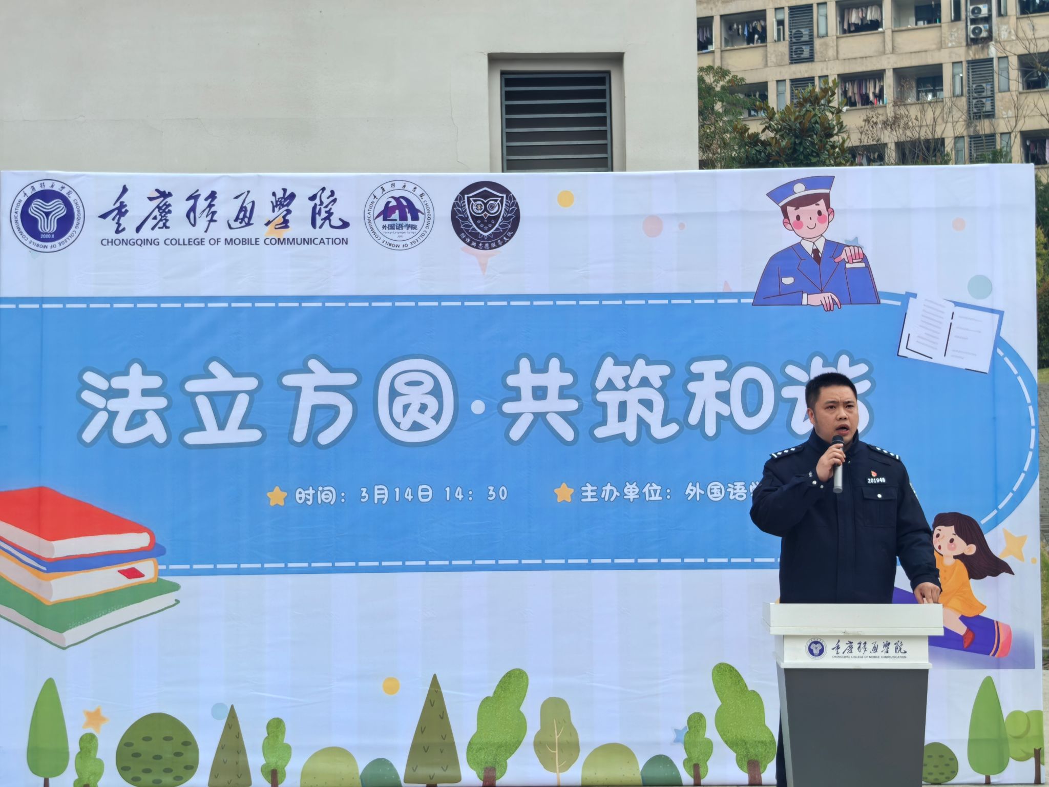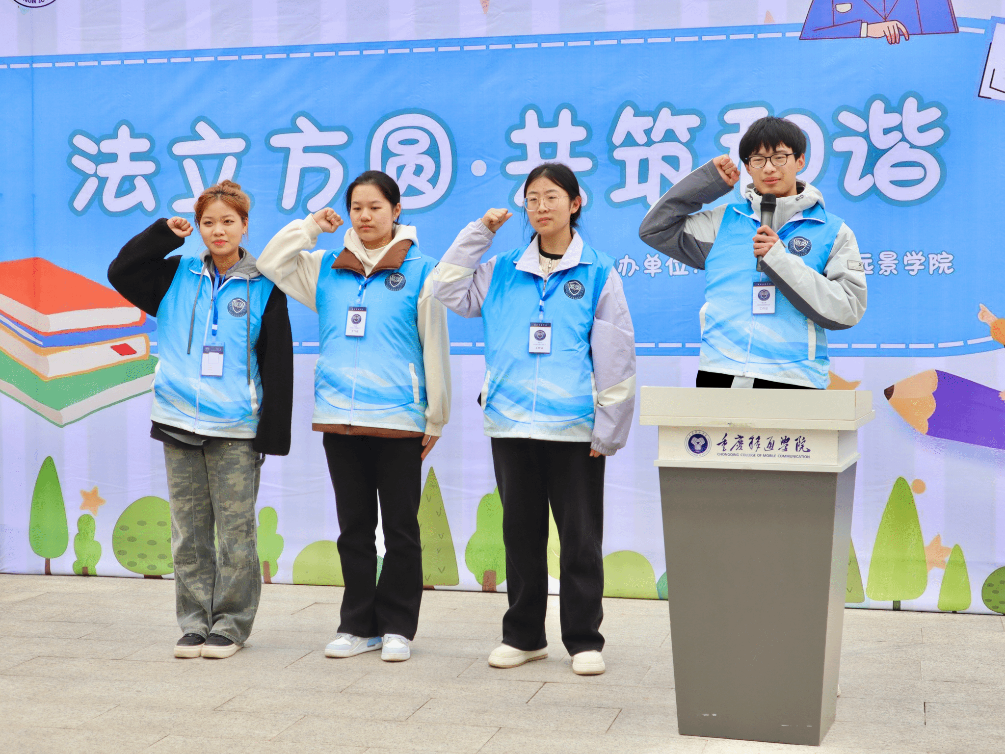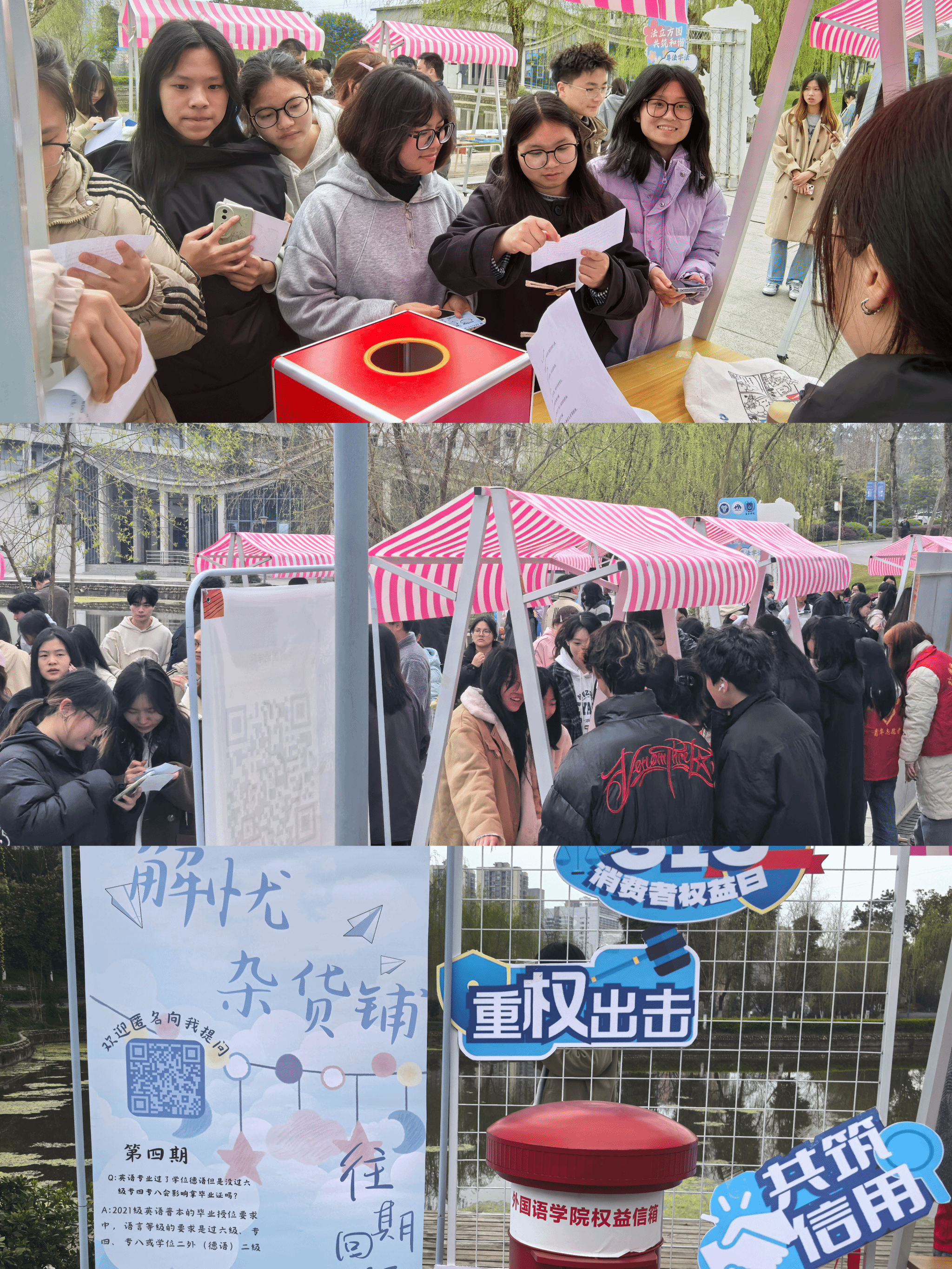 3月14日,春风拂面,正值315消费者权益日来临之际,一场别开生面的安全教育盛宴在天渠书院池塘旁拉开了序幕。"法正方圆,共筑和谐"外国语学院权益保护及反诈安全月启动仪式以宣讲+实践的形式,为学生构建了立体化的权益保护网。本次活动由外国语学院和远景学院联合举办,联合合川区公安局反诈中心、重庆农村商业银行等专业力量,打造出"理论教育+情景模拟+实践体验"三维教育矩阵,切实增强学生的权益保护意识和反诈能力,营造安全、和谐的校园环境。