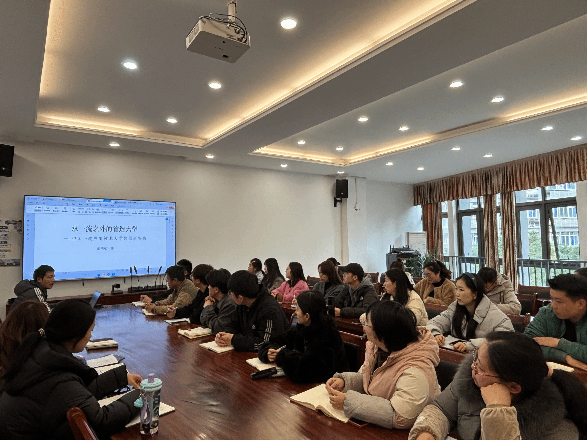 在集中学习会上,学生处全体教师共同研读彭鸿斌董事长的讲话内容以及《双一流之外的首选大学——中国一流应用技术大学的创新实践》一书。学生处处长陈帅详细解读讲话中关于教育理念、人才培养模式以及学校发展战略的核心要点,并结合书中提到的“四位一体双院制+特色教育”“极致的完满教育”“充分的通识教育”等理念,深入剖析其对学生工作的指导意义。通过深入学习,大家对彭鸿斌董事长提出的“双一流之外的首选大学”理念有了更深刻的理解,明确了学生工作在学生成长过程中的重要作用,认识到为学生营造良好的学习与生活环境、助力学生全面发展是学生工作的根本目标。