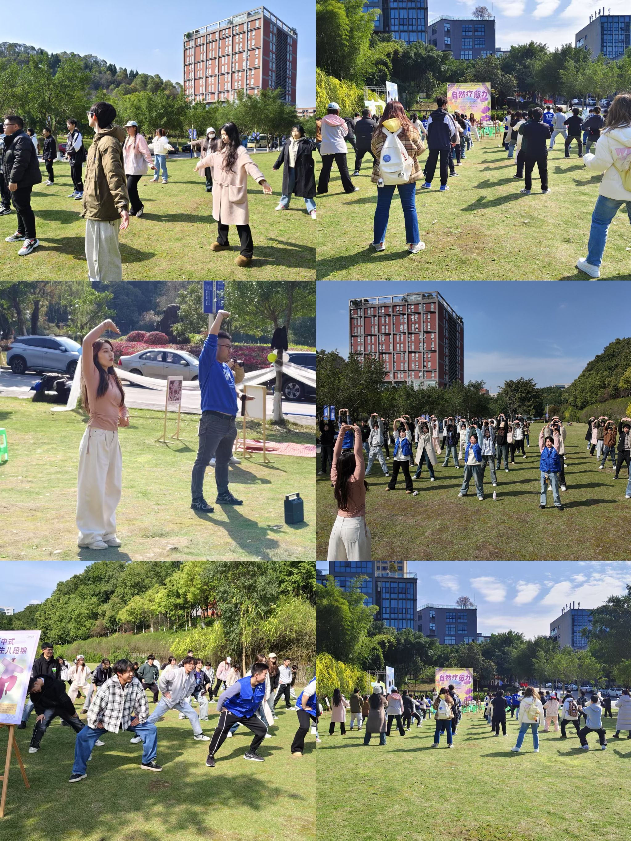 活动开场,鱼城老师带领学生在草坪上练习八段锦。从“双手托天理三焦”到“左右开弓似射雕”,老师细致讲解动作要领与呼吸节奏,学生们跟随练习。尽管部分同学动作稍显生疏,但专注投入,现场充满活力。活动将传统养生运动与心理健康教育结合,帮助学生在运动中释放压力。