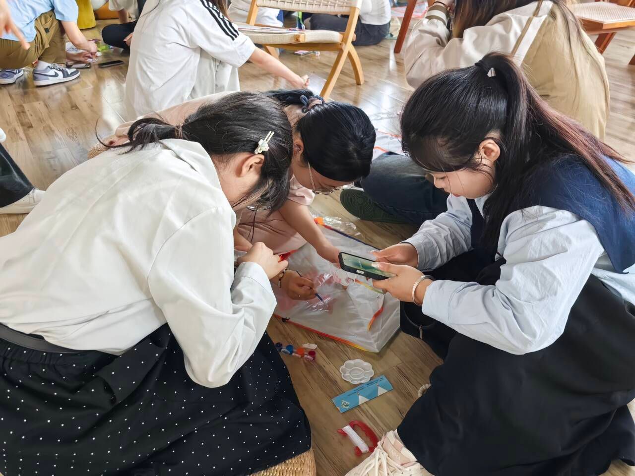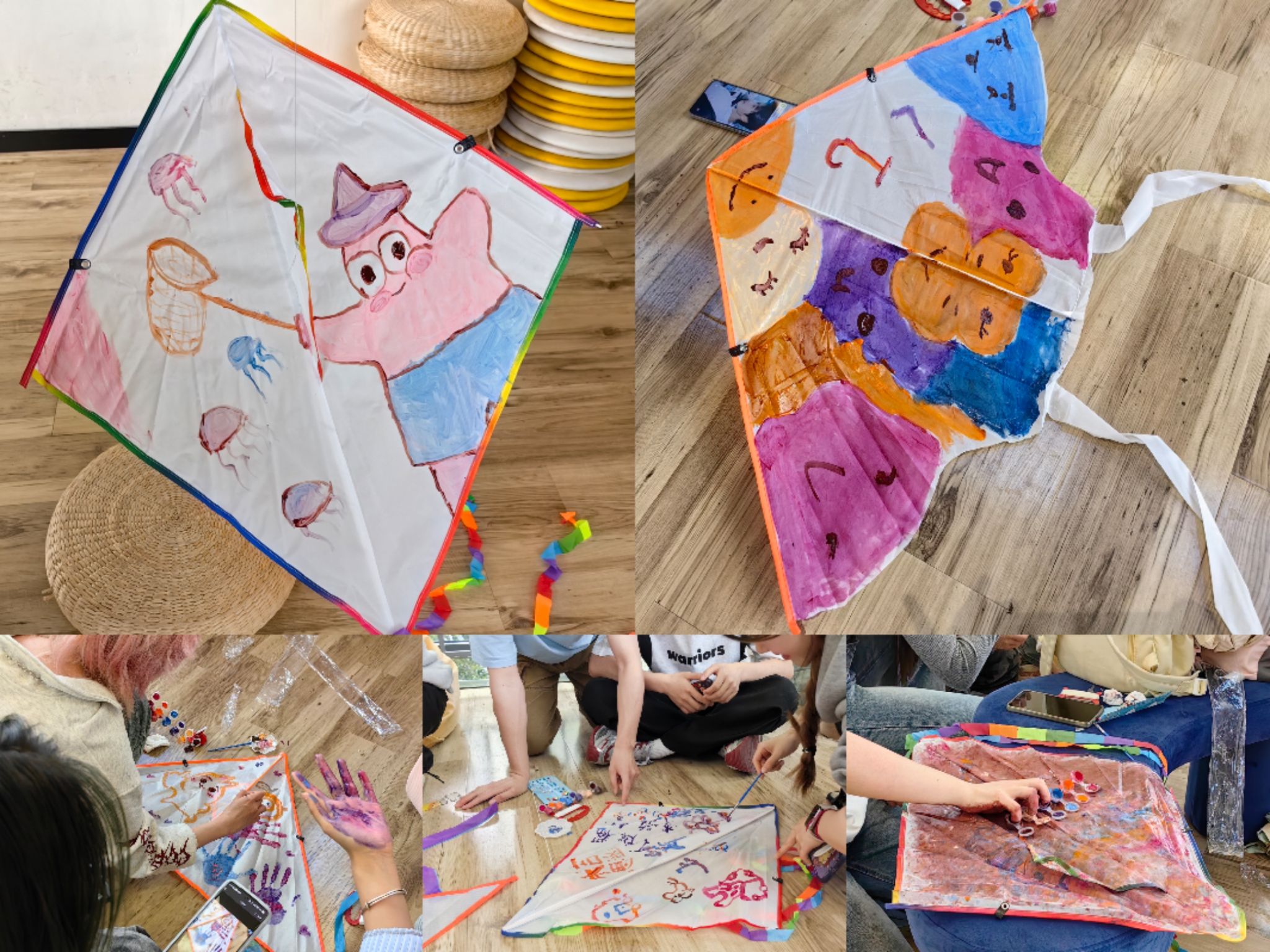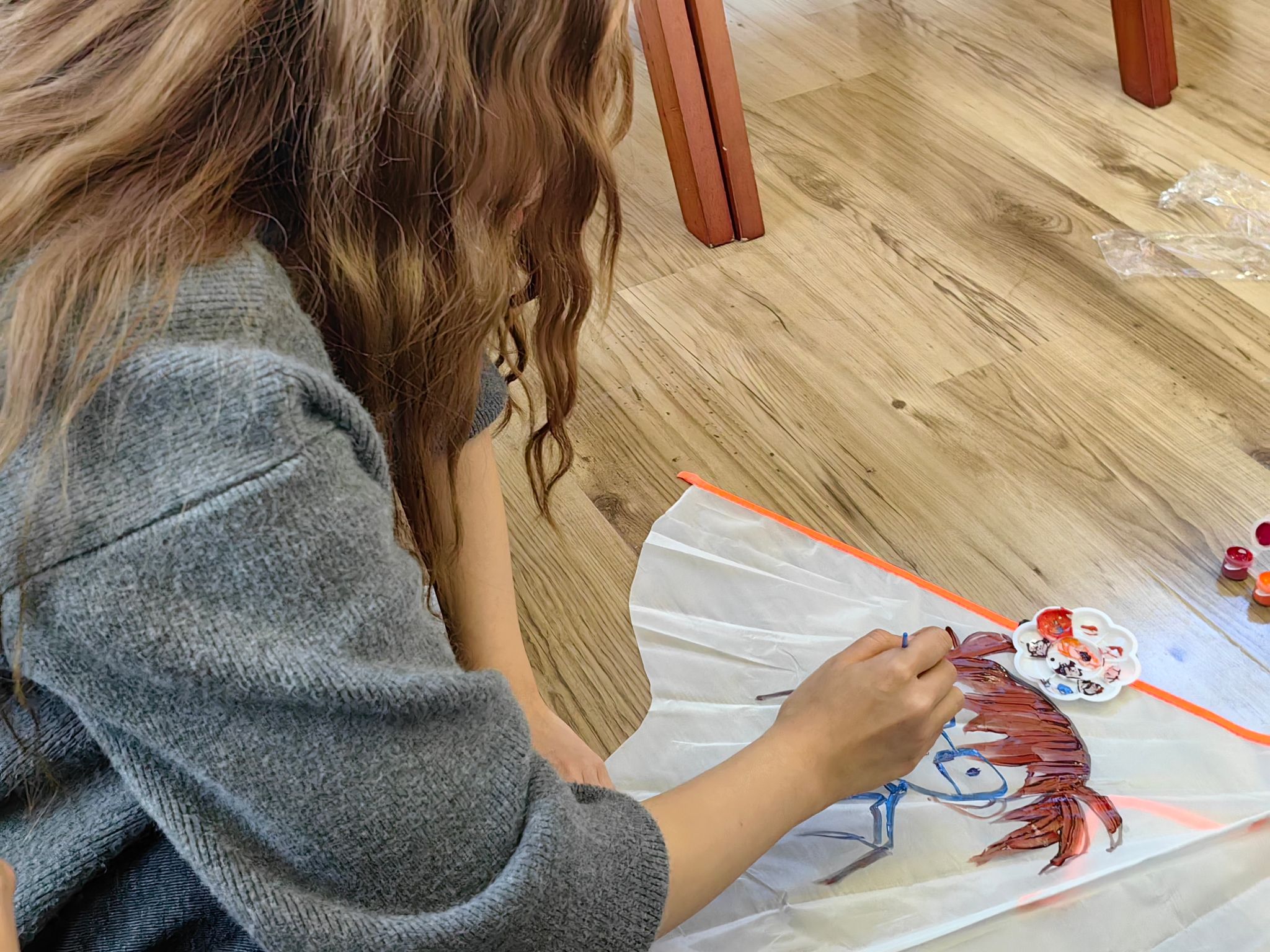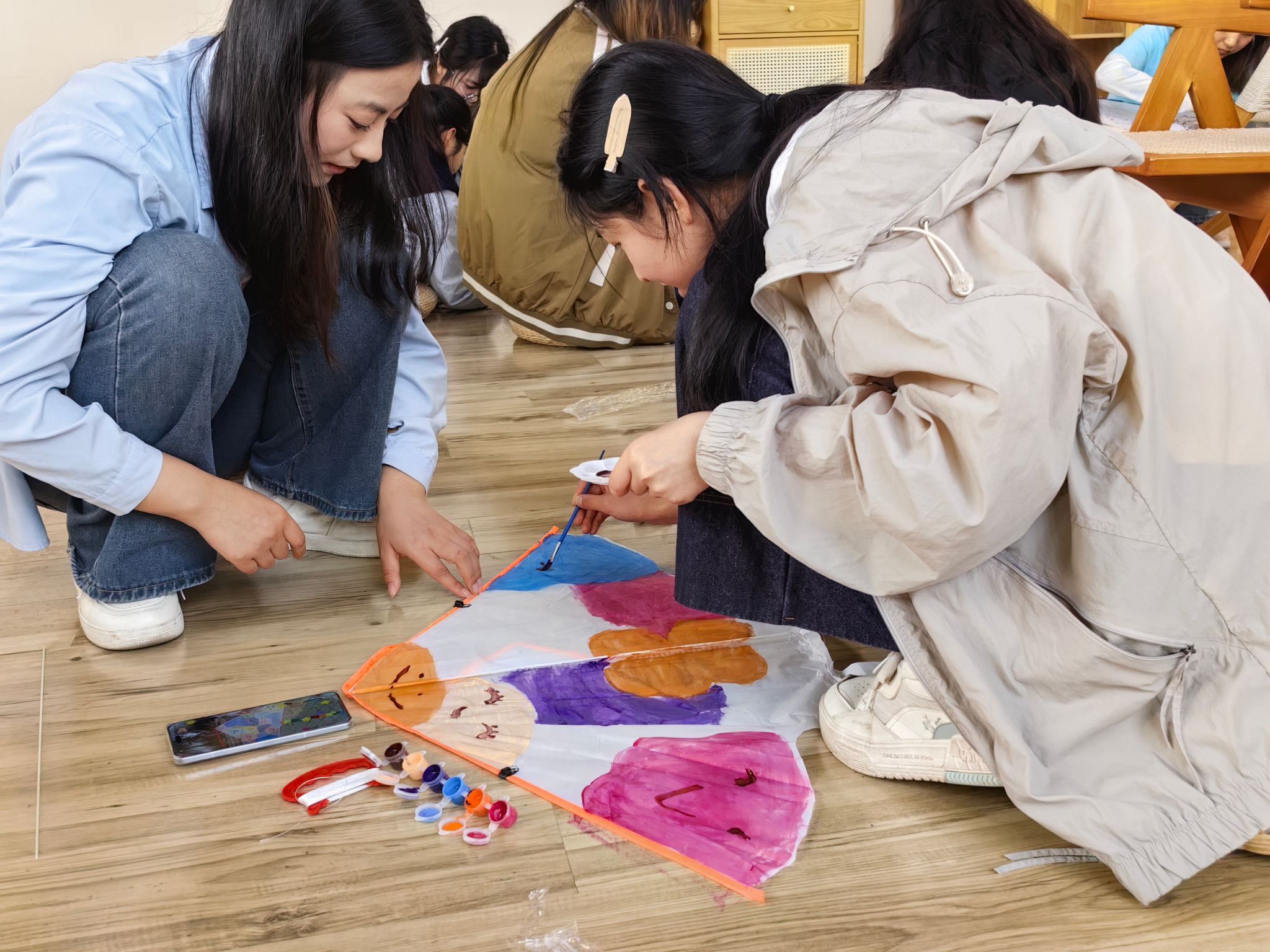 紧接着,手绘风筝环节开启。大家迫不及待地拿起画笔,蘸上自己喜欢的颜料,开始精心绘制心中的图案。有的同学画了代表玉棠书院的老虎,有的同学画上了象征友谊的派大星,还有的同学更是写上考研上岸的激励语。每一笔颜料的涂抹,都像是在把心中的烦恼一点点剥离。在这个过程中,同学们沉浸在创作的乐趣中,脸上洋溢着专注和喜悦,暂时忘却了生活中的烦恼。欢声笑语在场地中回荡,原本单调的风筝在同学们的笔下变得色彩斑斓、充满生机