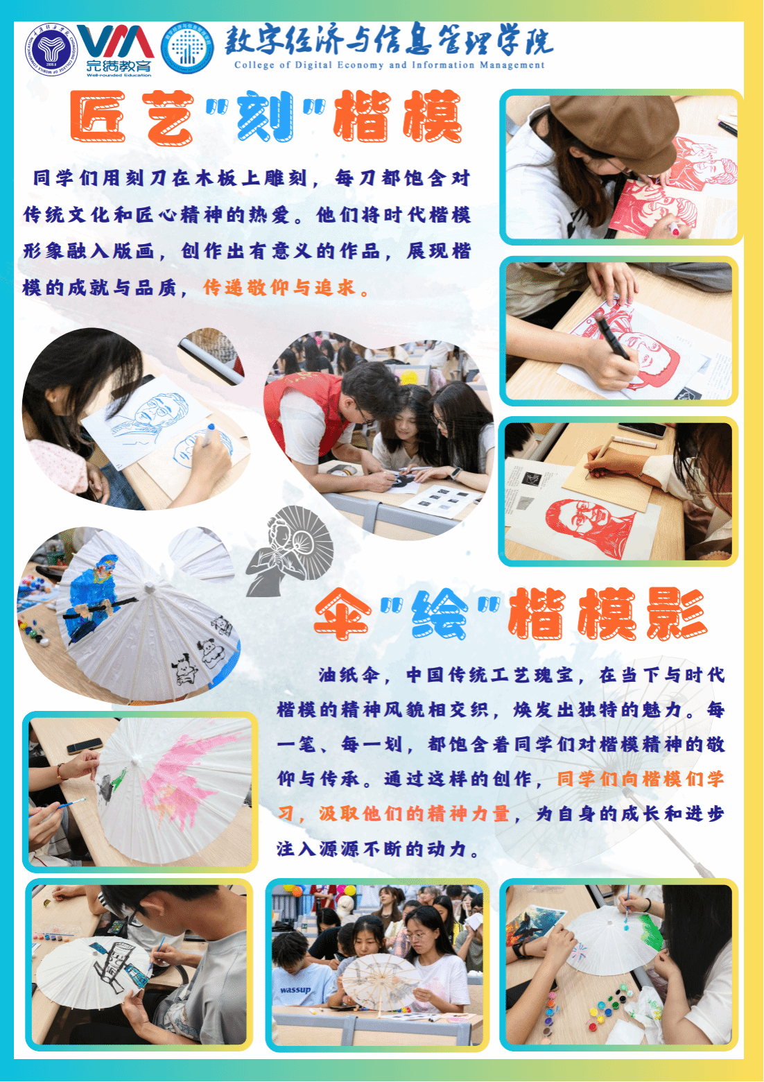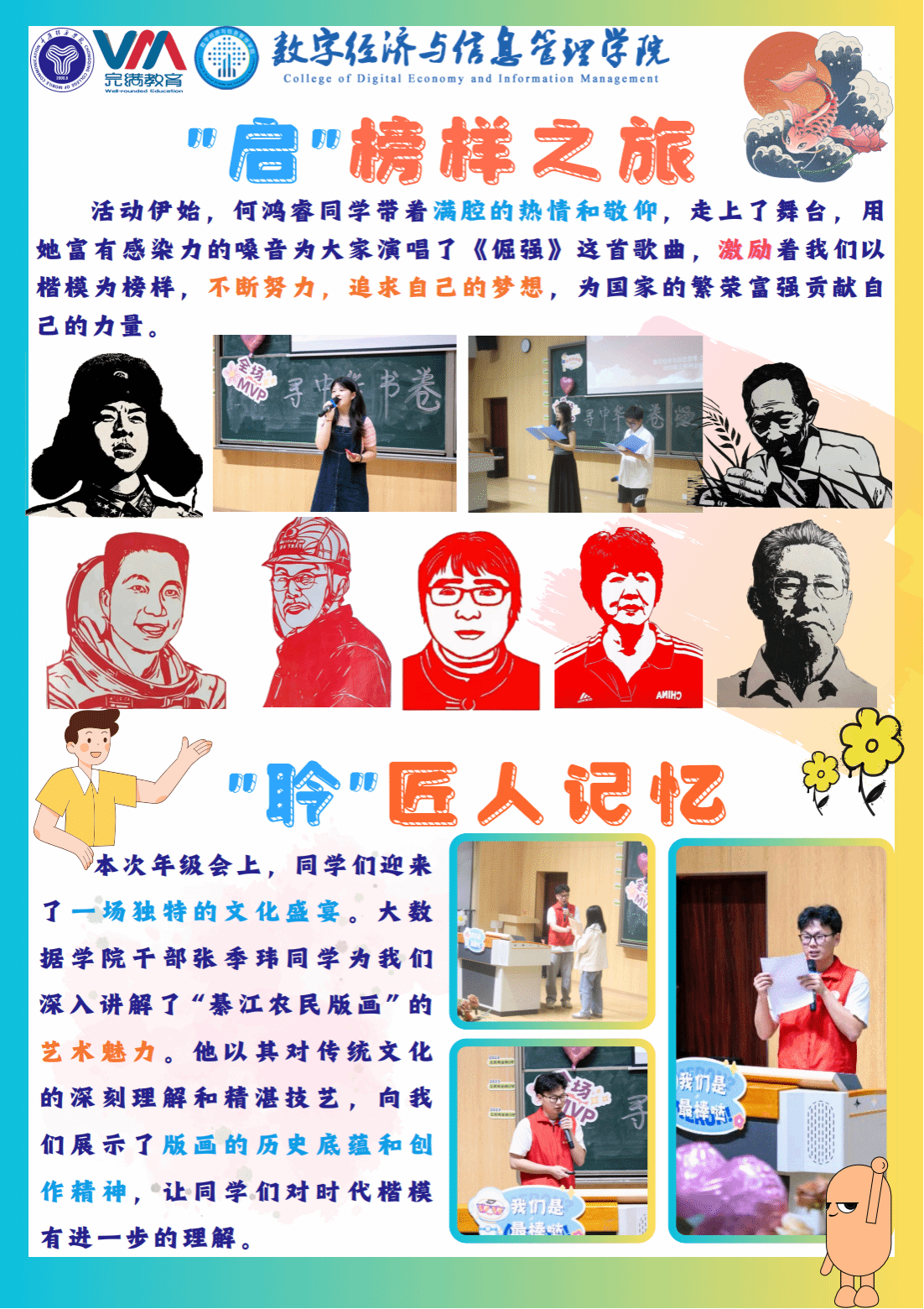在此次年级会中,我们匠心独运,巧妙布局,将一系列丰富多彩、寓意深远的环节紧密相连,通过“楷模之声”,生动演绎楷模不屈不挠的精神传承,让这份坚韧与执着在同学们心中生根发芽;借助“楷模之力”,展现团队协作的磅礴力量,激励同学们携手并进,共创辉煌;以版画艺术为桥梁,通过“版画之光”与“楷模映伞”的巧妙结合,让楷模精神在传统与时代的交响中绽放光彩,更是将楷模的形象与精神定格,激励同学们学习、奋发,稳步向前。