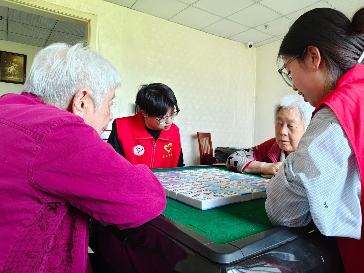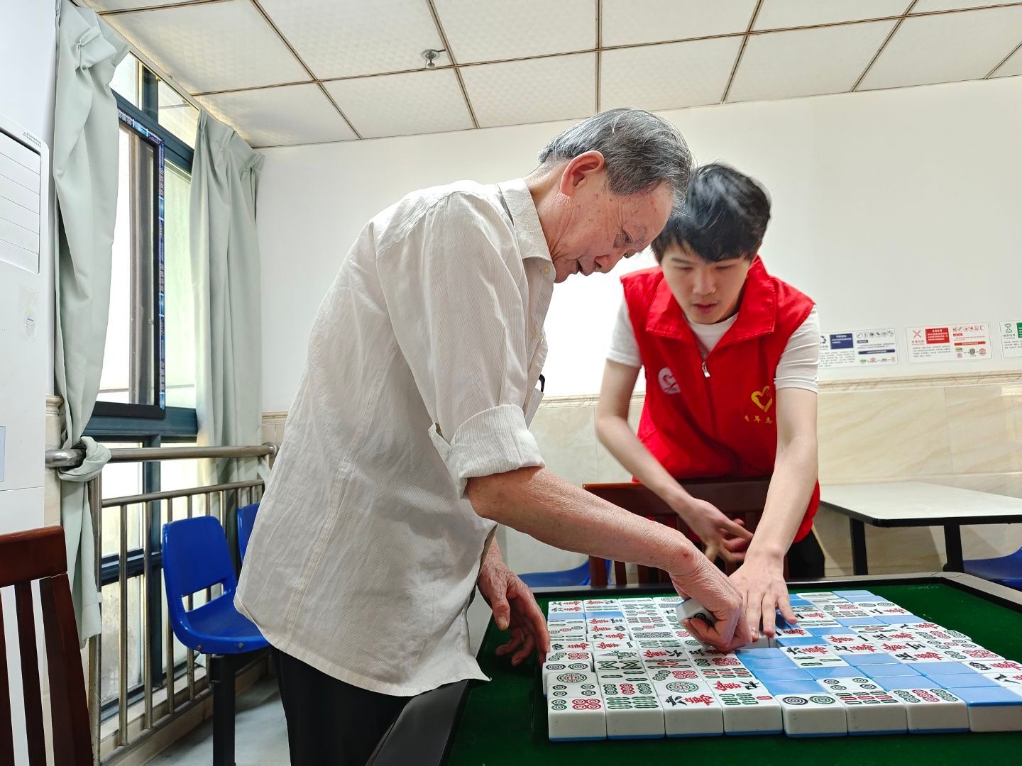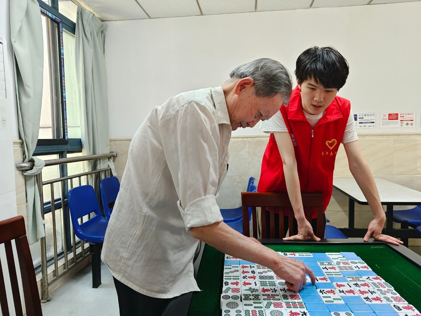 活动室内,麻将桌整齐排列,午后阳光为牌局镀上温情光晕。老人热情邀请志愿者加入“实战”,以“新手教学+实战演练”模式展开互动。经验丰富的两位奶奶化身年轻时的角色——“教师”,细致讲解牌型规则与战术技巧,志愿者专注聆听、虚心求教。对局中,双方默契配合,时而因妙招欢呼,时而为失误扼腕。欢声笑语间,年龄壁垒悄然消融,鲜活生动的形象跃然眼前——或为胜局得意挑眉,或因失手拍腿懊恼,全然打破刻板印象。方寸牌桌不仅承载娱乐之趣,更成为代际情感交融的纽带。