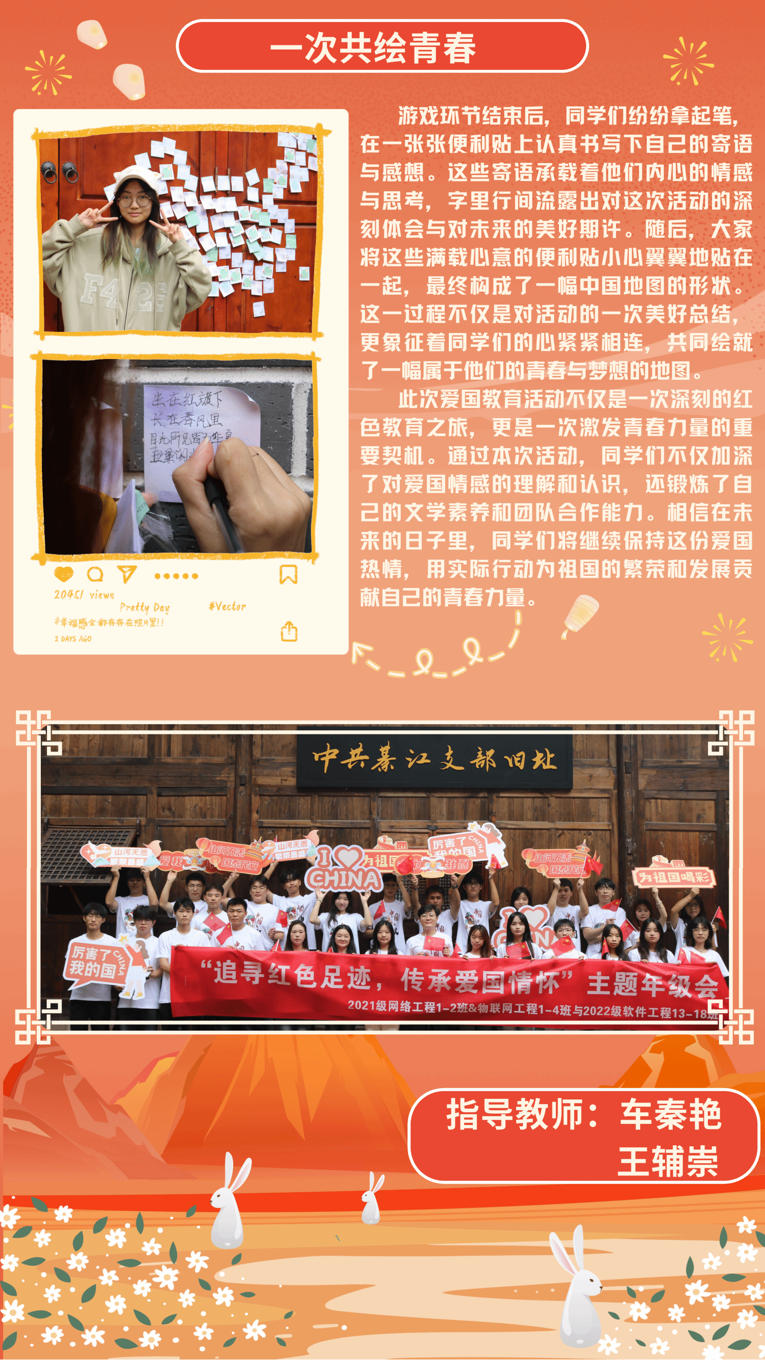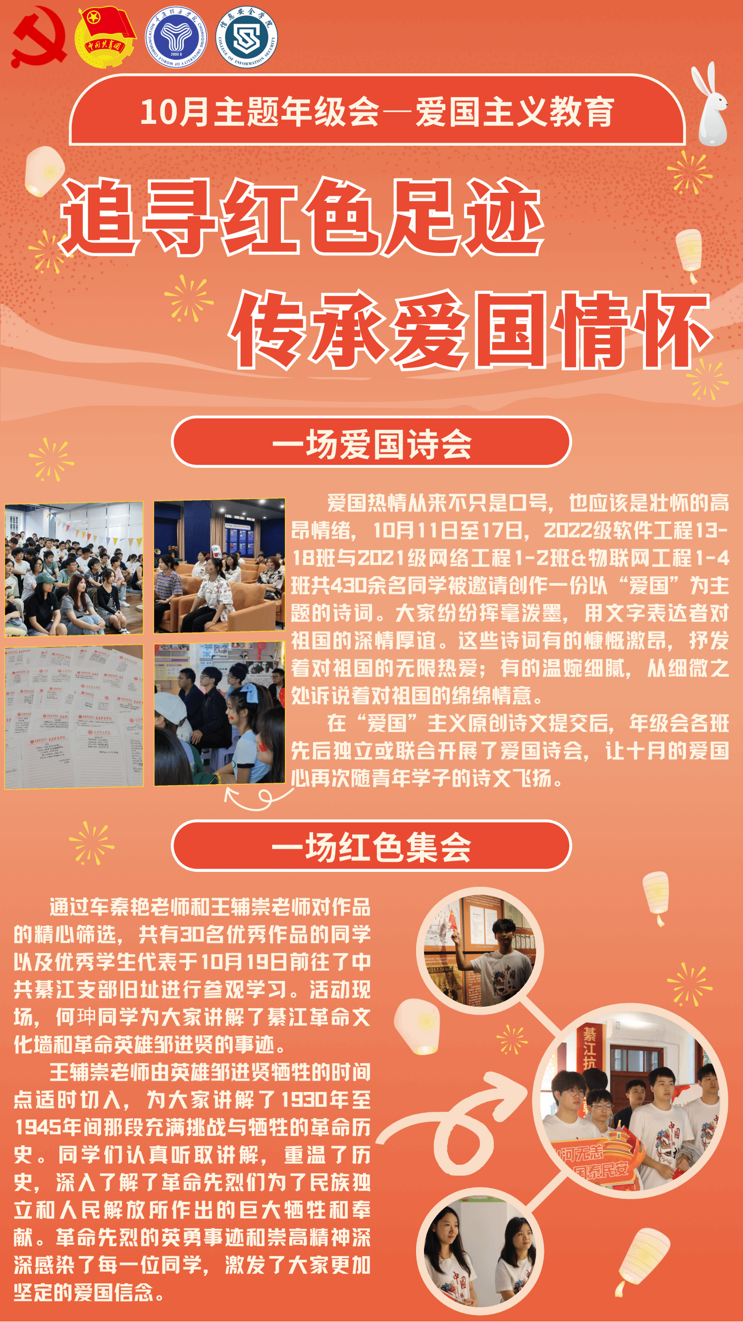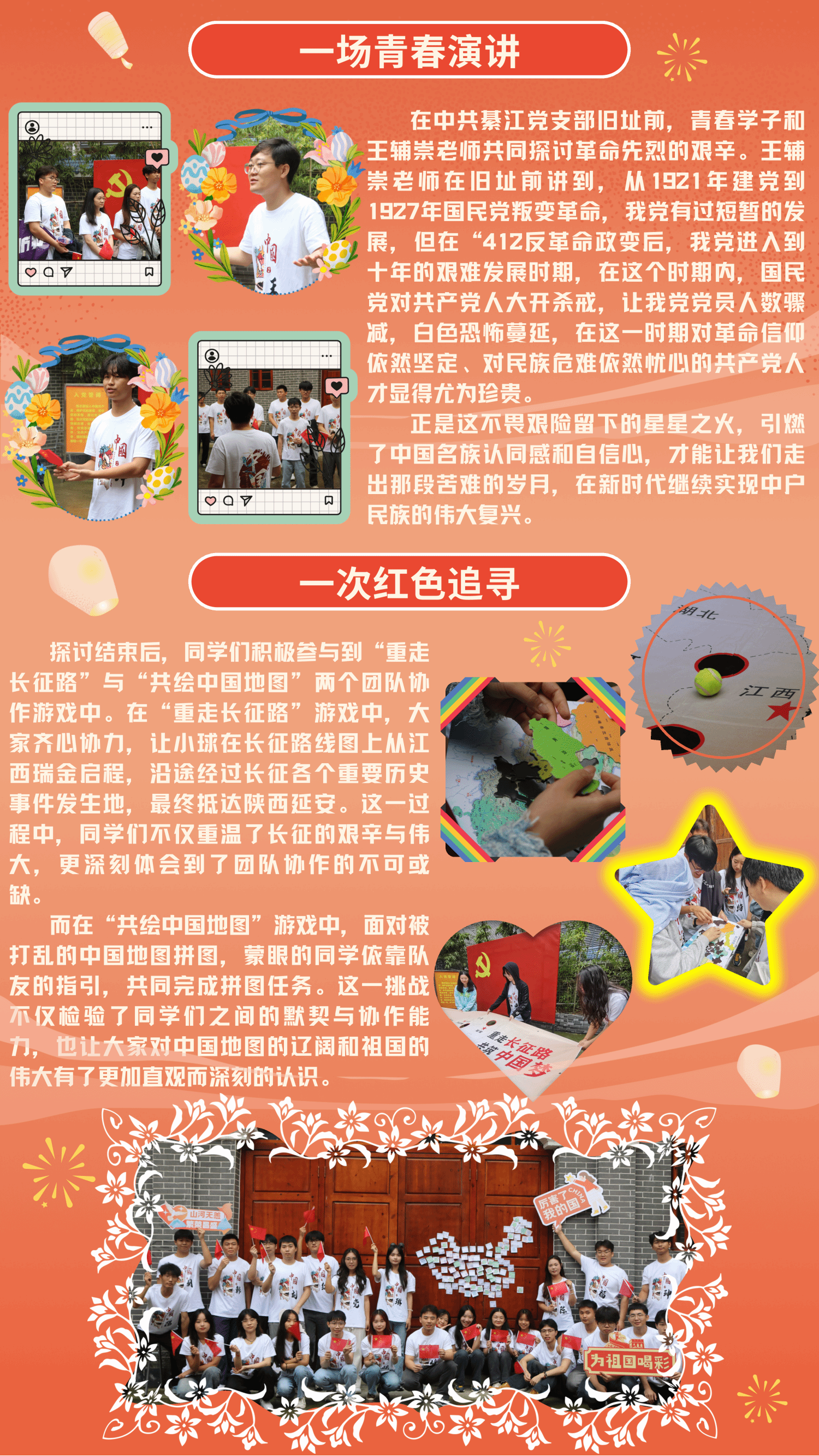 经验分享:本次年级会联合学院党支部共同举办,活动以“沉浸式教育+实践体验”为核心,通过多元形式引导学生从“被动学习”转向“主动传承”,让红色基因入脑入心。“爱国诗词创作”激发学生文化共鸣,实地参观与互动体验深化教育内涵。在参观中共綦江支部旧址时,学生讲解员带领同学们回顾党的奋斗历程,通过重走长征路、共绘中国地图等游戏,让学生在协作中凝聚集体力量。