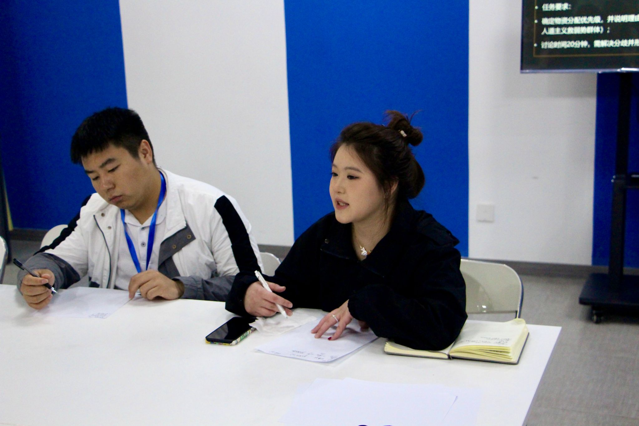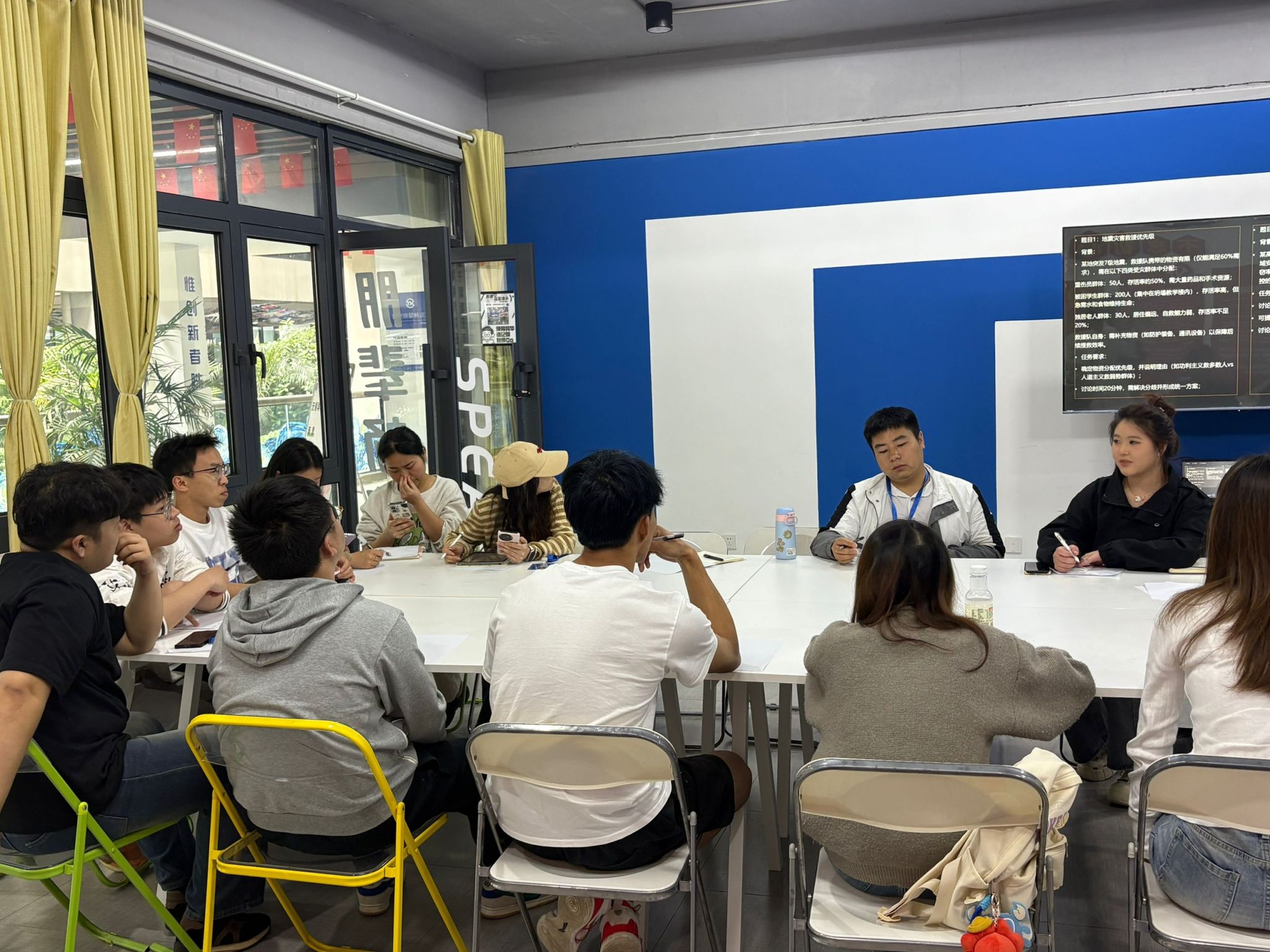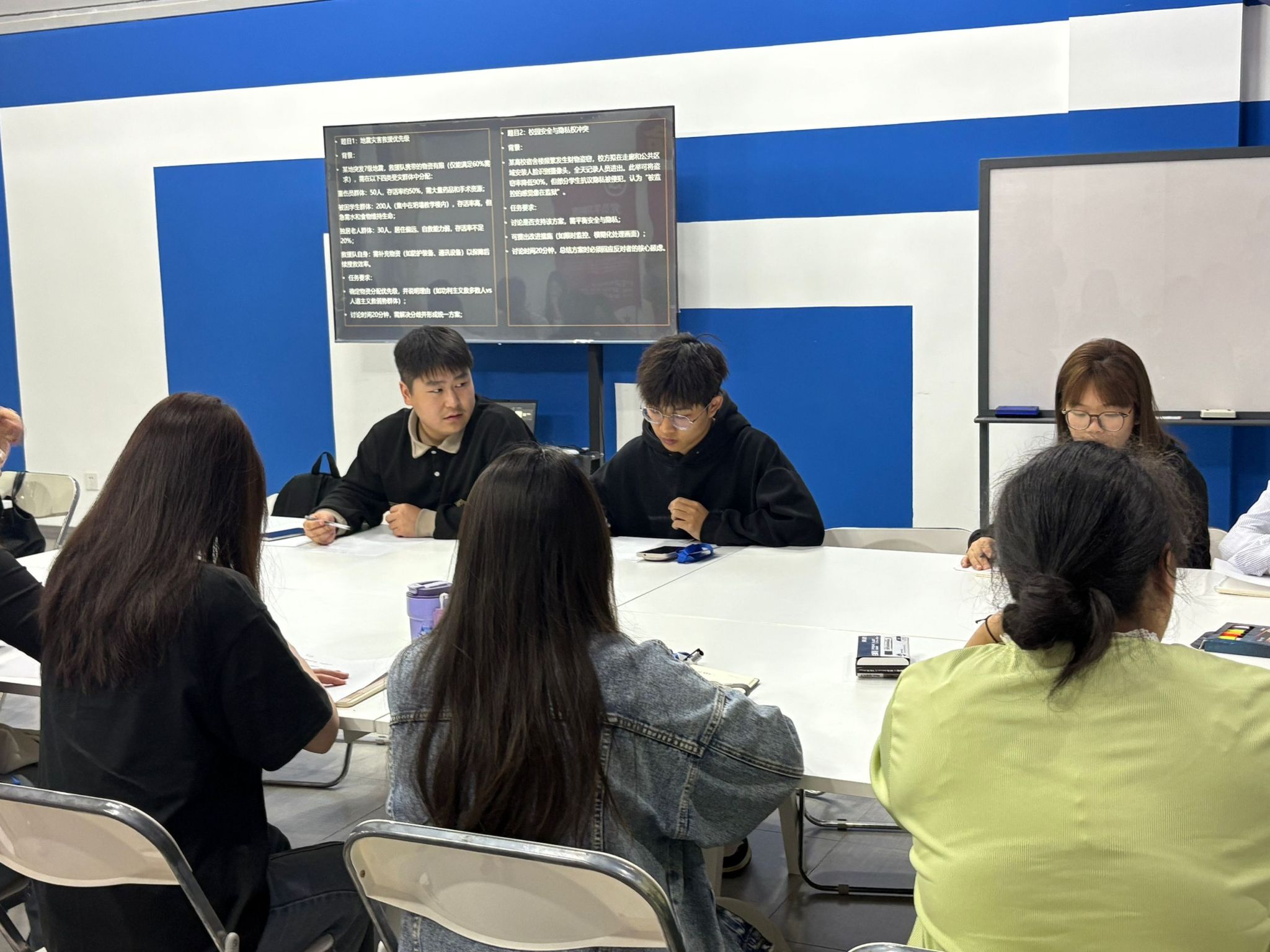 随后的实践环节,同学们展开了无领导小组讨论模拟演练。活动围绕“地震灾害救援优先级排序”和“校园安全与隐私权平衡”两大典型议题进行,参与者被分为两个小组深入探讨。讨论期间,各小组思维碰撞激烈,面对不同情境,同学们相继提出分级响应机制、多方利益协调等创新性解决方案,充分展现出批判性思维与应变能力。全程观察后,陈老师对同学们的表现给予了点评,肯定了主动引导讨论的同学所展现出的领导潜质,同时建议部分同学在表达时注意逻辑层次;表扬了善于倾听的同学所体现的团队意识,也指出应适时表达自身观点;对于提出质疑的同学,指导其如何以建设性方式推动讨论。这些针对性建议,使同学们对无领导小组讨论的考察要点有了更为深刻的理解。