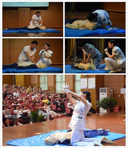 在此次培训中,护士长和护士对心肺复苏、哈姆立克手法等重要理论进行了详细的讲解,引起了同学们的浓厚兴趣。还在亲身示范抢救方法后邀请现场同学进行操作手法的示范和五分钟创伤急救情景模拟演示,并对其进行指导。同学们积极响应,亲自实践,现场气氛异常活跃,将本次的培训推向了高潮。通过实践,同学们切实的掌握到了抢救技术和实际操作要领,以及在现实生活中如何判断心脏骤停,如何正确的使用心肺复苏等技术。