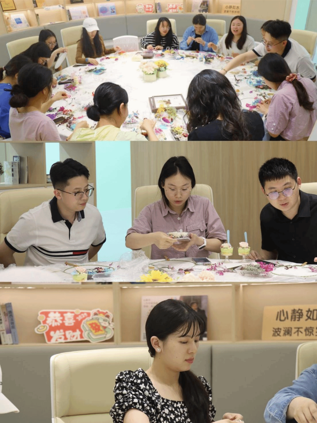 非遗中草药画以中药材为材,通过拼贴、镶嵌技法,在载体上创作花鸟山水的图案,融合中医药文化与美学价值,极具传承意义。跟随着杨桂华老师的讲解,老师们以中草药为笔,亲手创作精美图案,并完成裱装工序。创作过程中,多重感官体验助于身心舒缓,接触自然植物减压,成品带来的成就感提升自我效能,实现艺术与疗愈的双重升华。活动最后,特设健康茶歇与感悟分享环节。精美的茶点、鲜果搭配花果茶,为老师们补充体力,借美食激发多巴胺分泌,在味蕾享受中回味非遗与内心疗愈的交融之美,可以畅所欲言分享体验感悟。