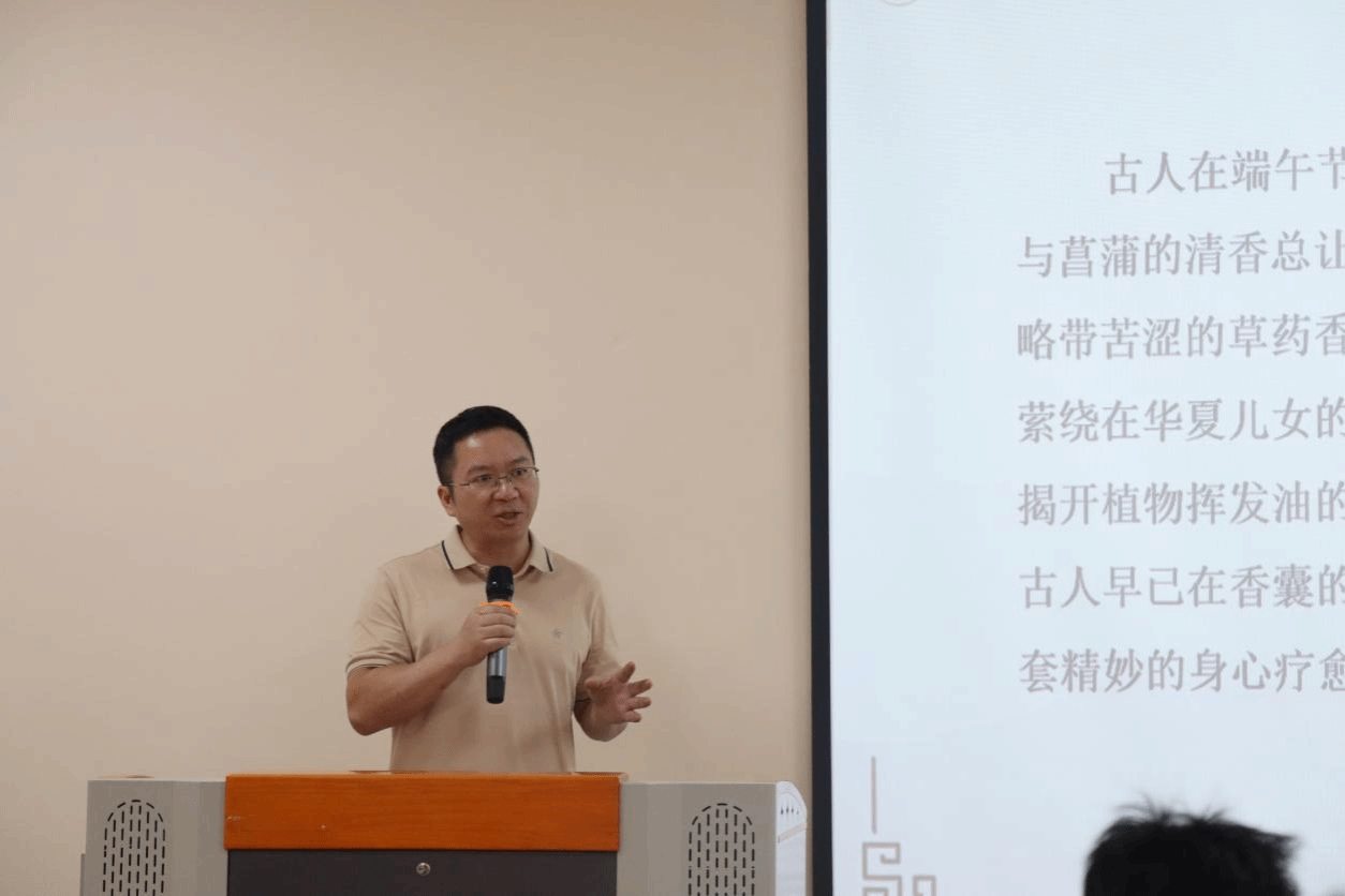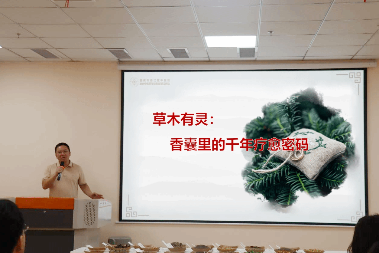 活动伊始,李东芹老师介绍本次活动以非遗文化为核心,采用主、分会场联动形式。主会场邀请綦江区中医院治未病中心梅雪峰主任开展“香囊里的千年疗愈密码”专题讲座,并指导教师们体验香囊妙用,在药香中疗愈心灵;分会场由心理中心专兼职教师带领,同步开展曼陀罗压花团扇、植物拓印染、非遗中草药画三场特色活动。