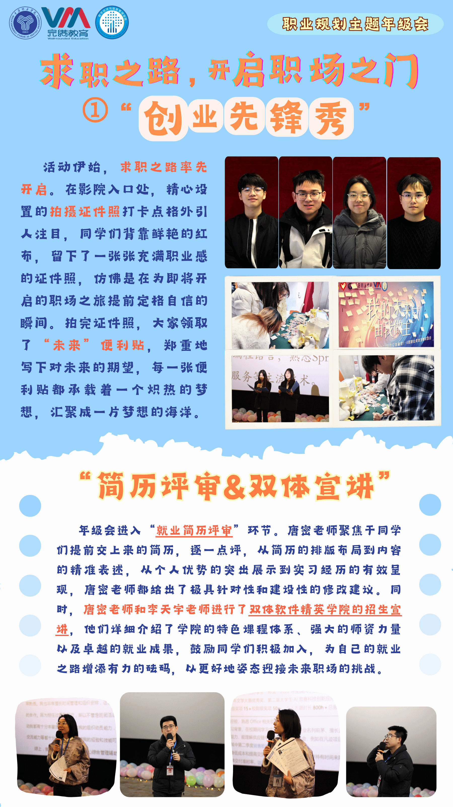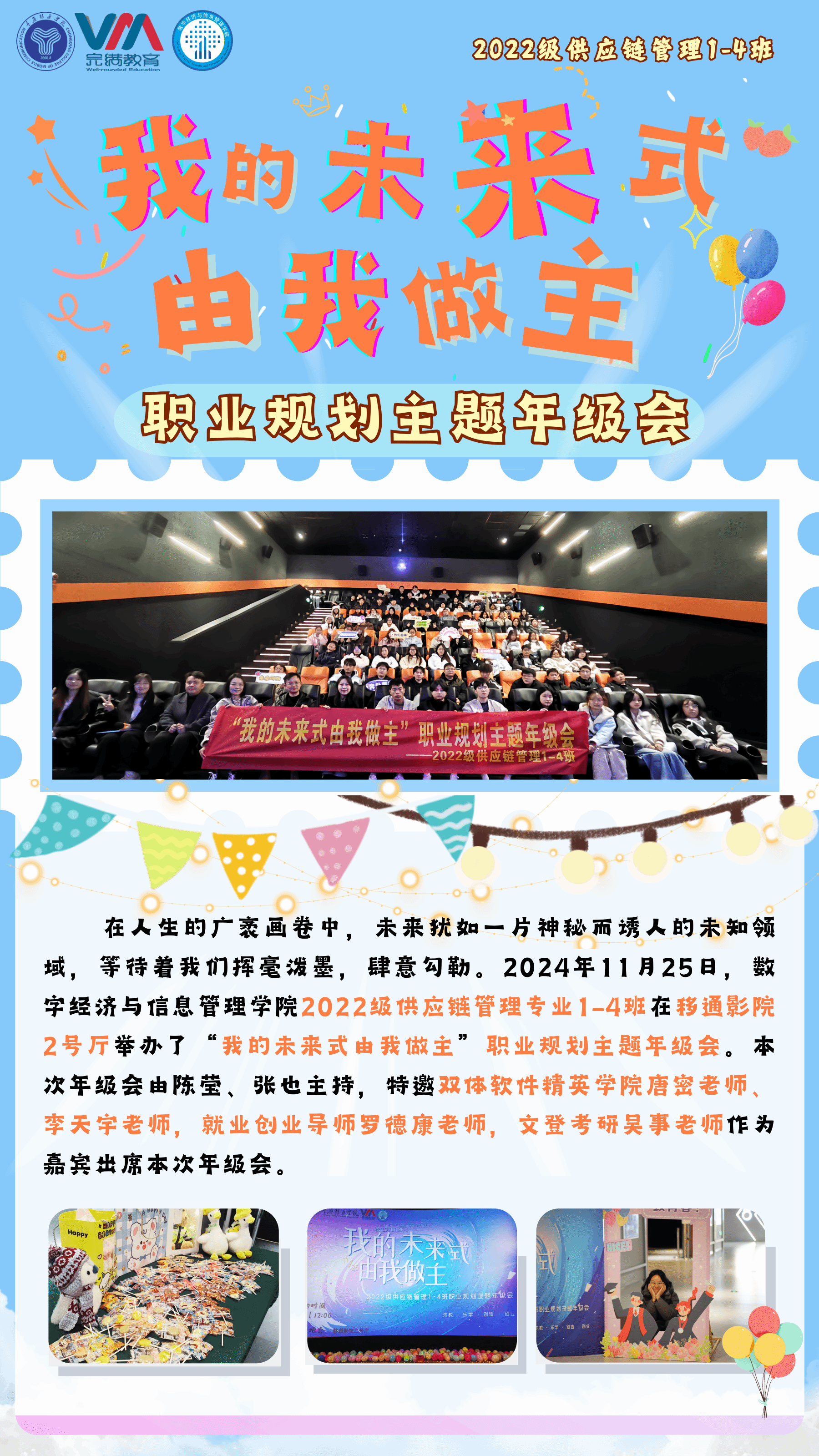 本次年级会选择移通影院2号厅作为活动场地,利用其良好的视听设备为活动提供支持。在影院入口处设置拍摄证件照打卡点,营造职场氛围。同时,准备好活动所需的物资,如“未来”便利贴、气球等。通过班级群、宣传海报等方式向学生宣传活动信息,包括活动主题、时间、地点、嘉宾介绍等,提高学生的参与积极性。