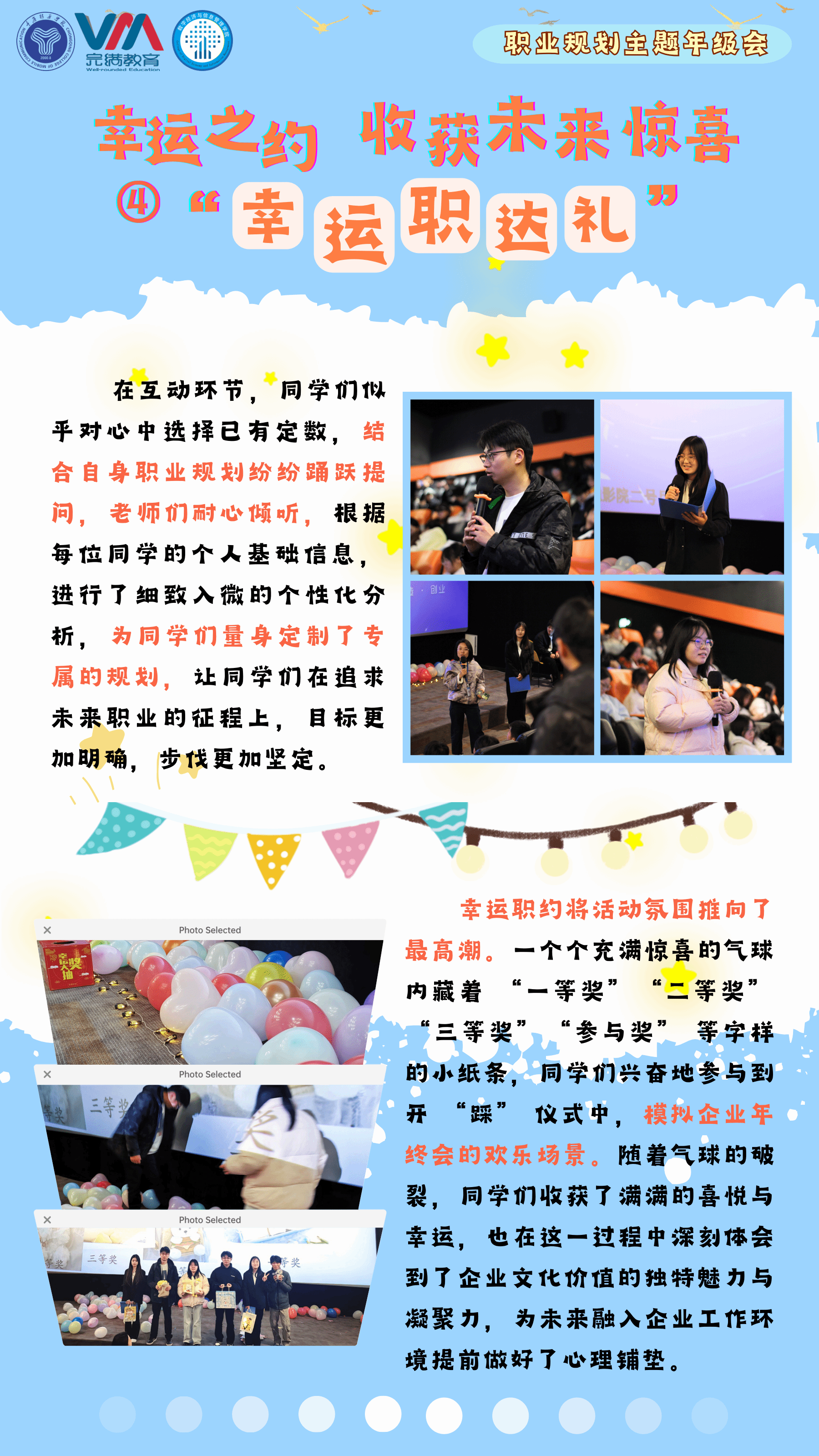 本次年级会同学们在活动中积极参与、互动体验,对职业规划有了更深刻的认识和理解,通过各个环节的学习和交流,他们明确了自己的职业目标,掌握了职业规划方法,为未来的职业发展做好了充分的准备,帮助同学们真正实现“我的未来式由我做主”。育人成效:活动以“严肃内核+轻松外壳”打破说教模式,学生参与度显著提升。手册竞赛加深规则认知,学霸干货提供可复用的方法,而小品与抽奖则缓解了备考压力。