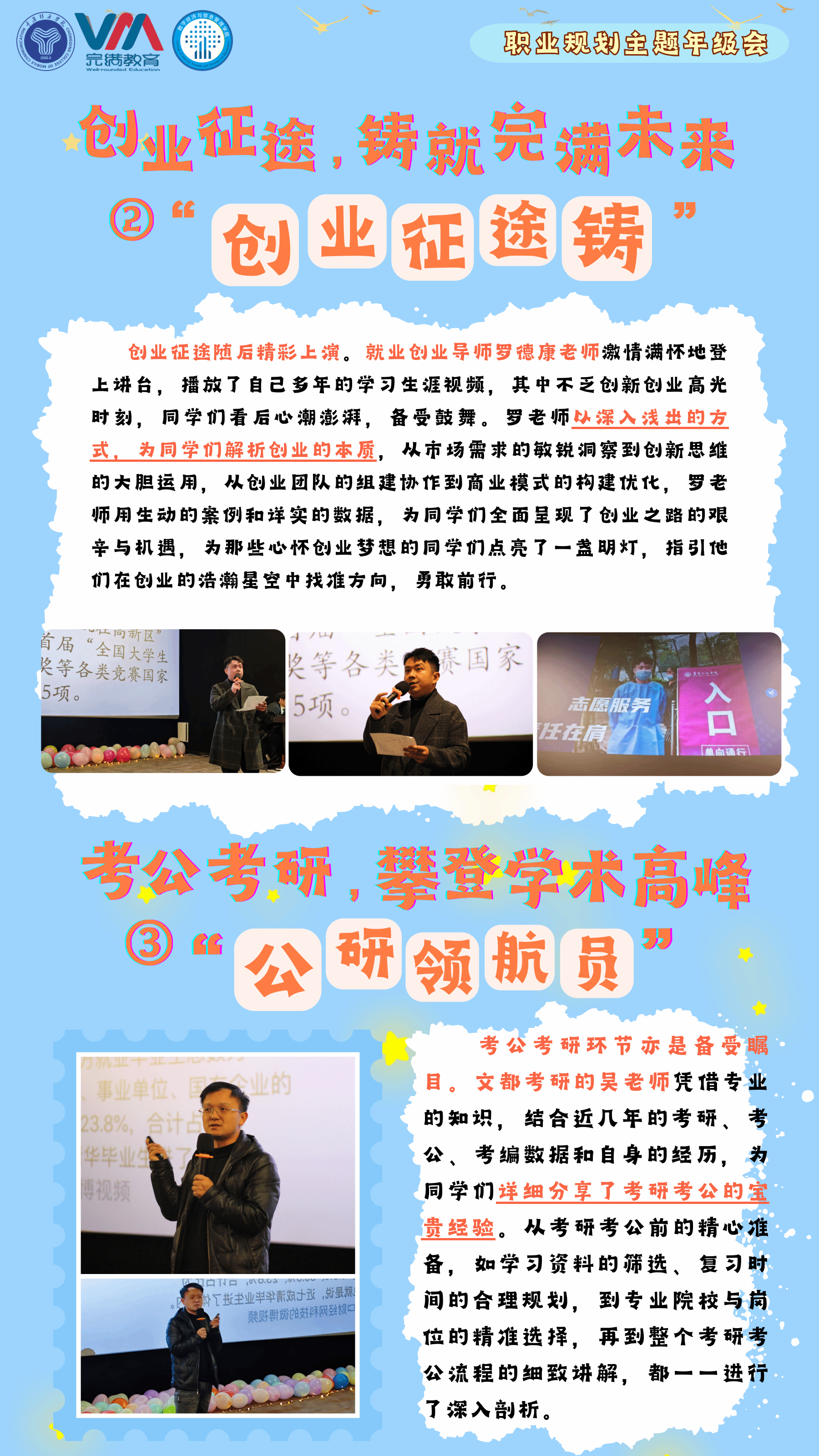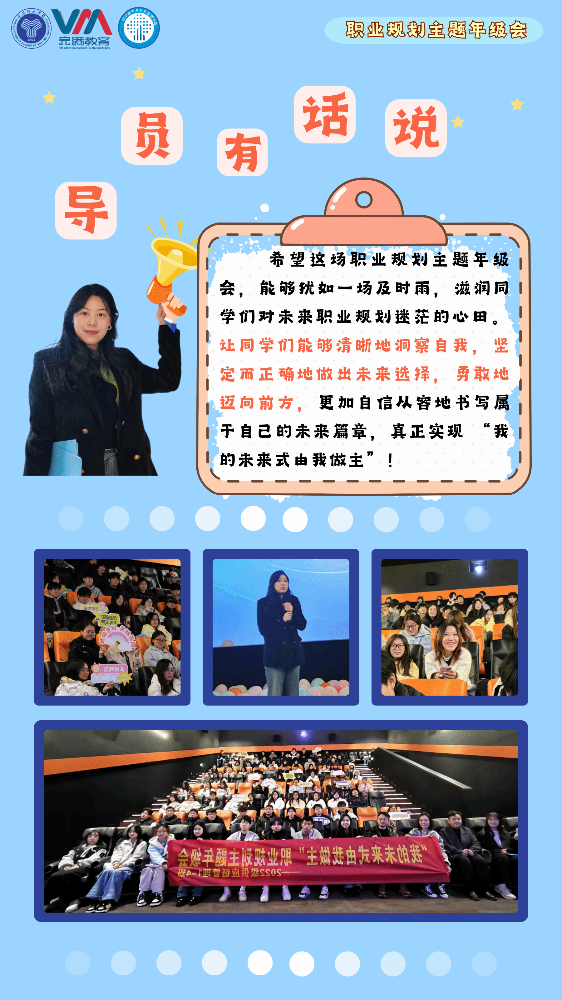 经验分享:结合学生处于大学关键时期,对未来职业方向感到迷茫的现状,本次年级会将主题定为“我的未来式由我做主”,旨在帮助学生明确职业目标,掌握职业规划方法,为未来的职业发展做好准备。
