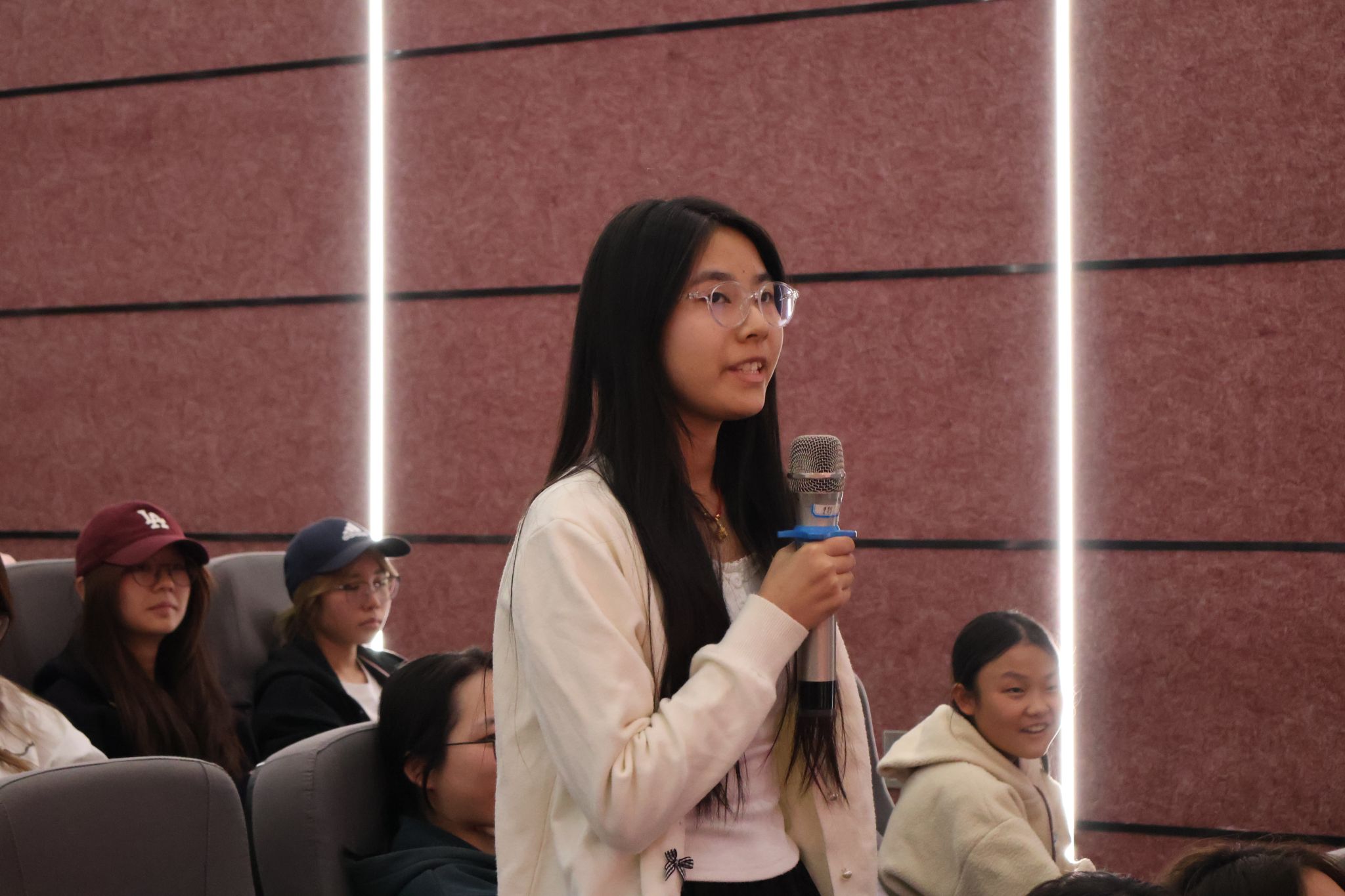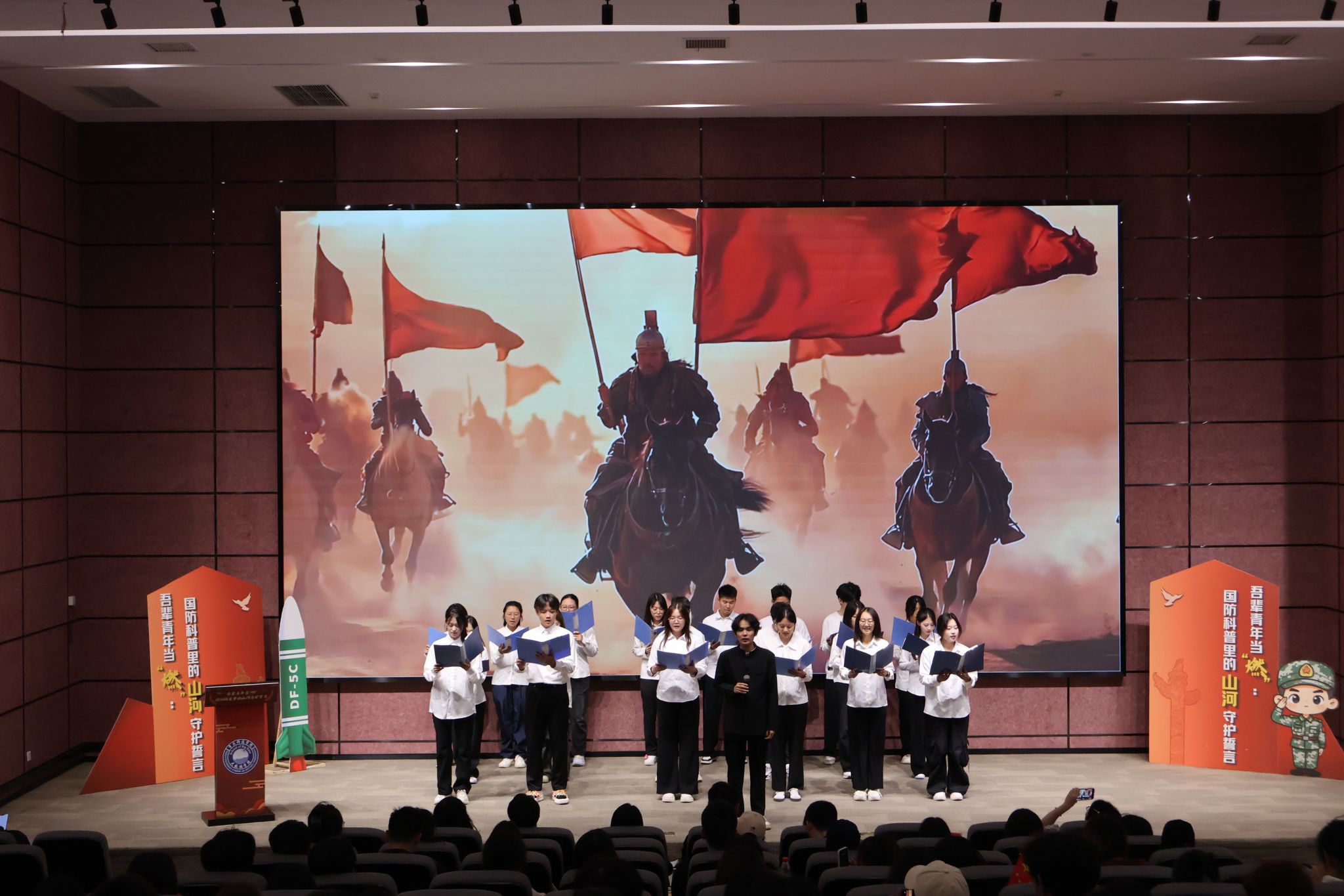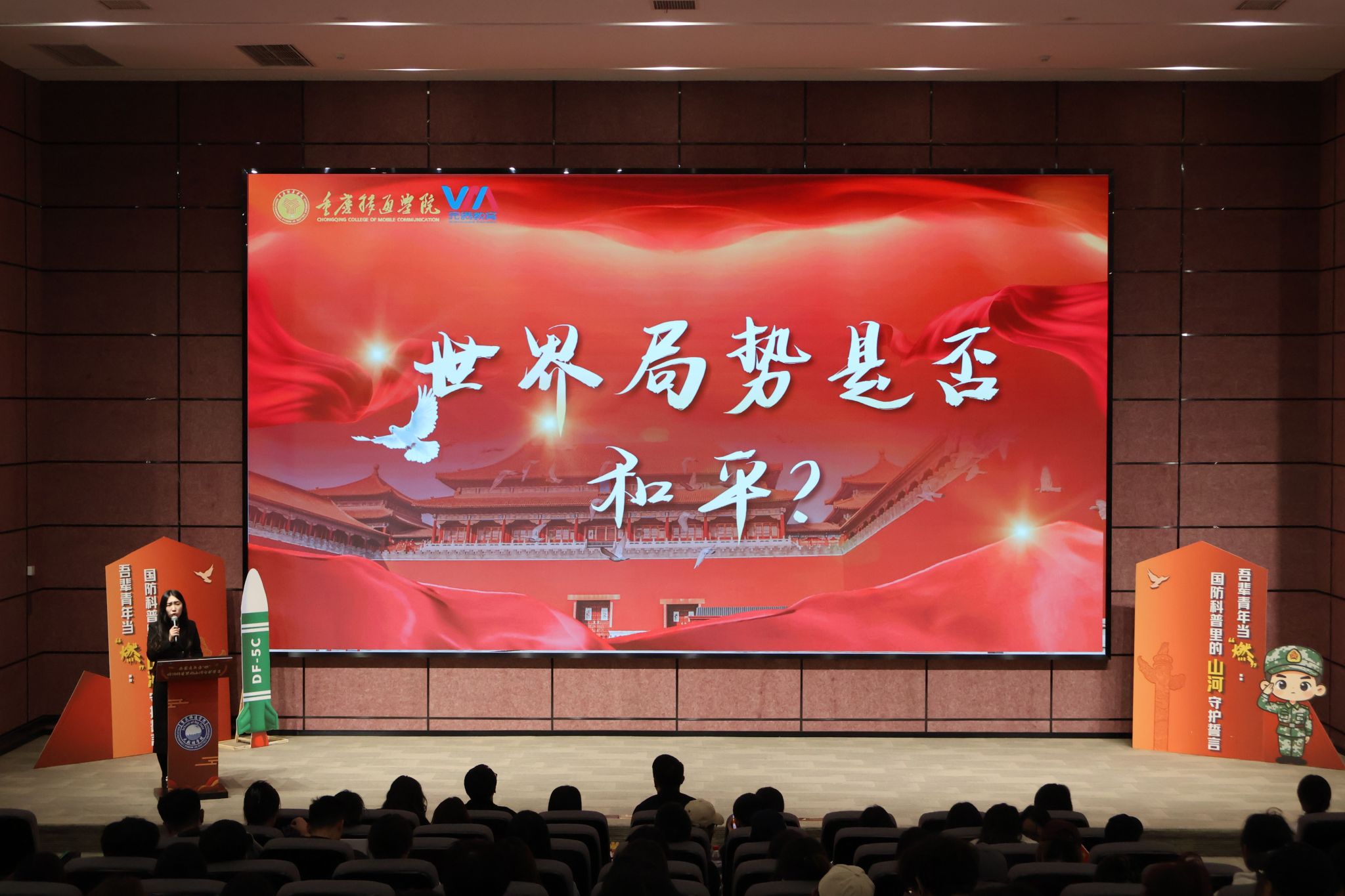 “硝烟散尽是曙光,山河已无恙……”活动伊始,辅导员的独唱《山河已无恙》搭配震撼的背景混剪视频,瞬间将在场师生带入历史情境。随着1分30秒的旋律落下,“世界局势是否和平?”的互动提问引发沉思,加沙冲突的对比视频更让大家深刻体会到:所谓“寻常”安宁,皆因国防力量在默默守护。情感的共鸣为整场活动奠定了深沉的爱国基调。