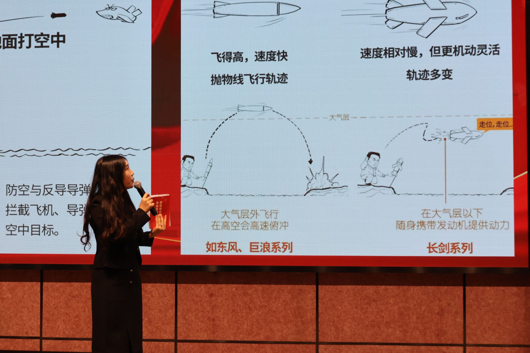 热搜话题的引入让课堂氛围转向轻松热烈。9.3阅兵的精彩片段播放时,现场不时响起赞叹声,学生朗读的趣味网友评论与辅导员的幽默解读巧妙衔接,自然引出对“东风快递”的科技探究。在“东风解码”环节,硬核科普与趣味竞赛完美融合:从导弹分类的基础讲解,到东风-5C“终极保险”的定位解析,再到全球射程、分导多弹头两大绝技及液体燃料战略选择的深度科普,知识点层层递进。随后的小组抢答竞赛中,同学们踊跃举手、快速应答,将知识要点牢牢掌握。