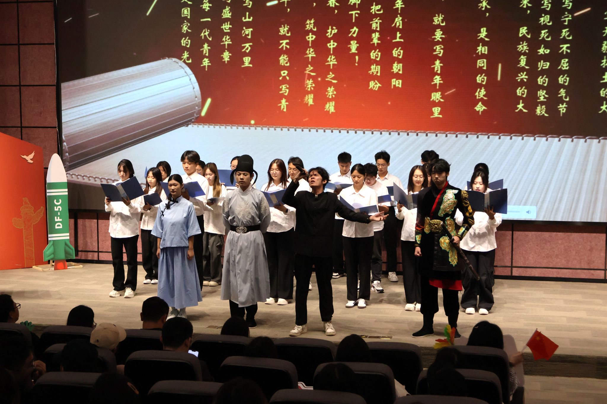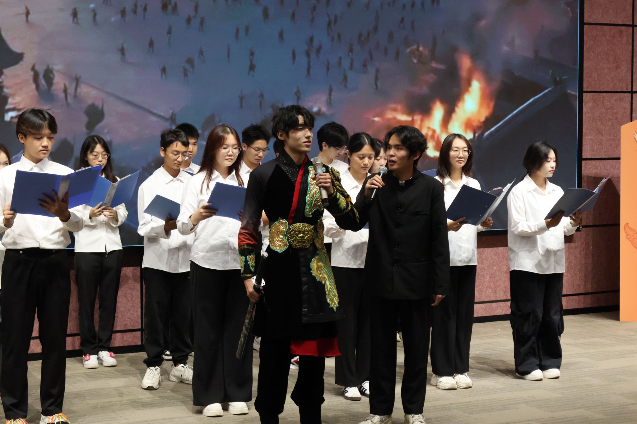 当灯光渐暗,朗诵剧《青年志》登场,以“时空对话”串联起跨越千年的爱国情怀。霍去病携“封狼居胥”的壮志追问当代守护,主诵者以“芯片突破筑科技防线、边防缉毒抗无硝烟之战”作答;文天祥怀“人生自古谁无死”的赤诚探寻文脉传承,主诵者以“文物珍藏、绝学传承”回应;赵一曼持“誓志为人不为家”的信念嘱托使命,主诵者用“医疗志愿逆行、子弟兵冲锋”诠释担当。最终,“以吾辈之青春,护中华之无恙”的齐声朗诵,将活动推向情感高潮。