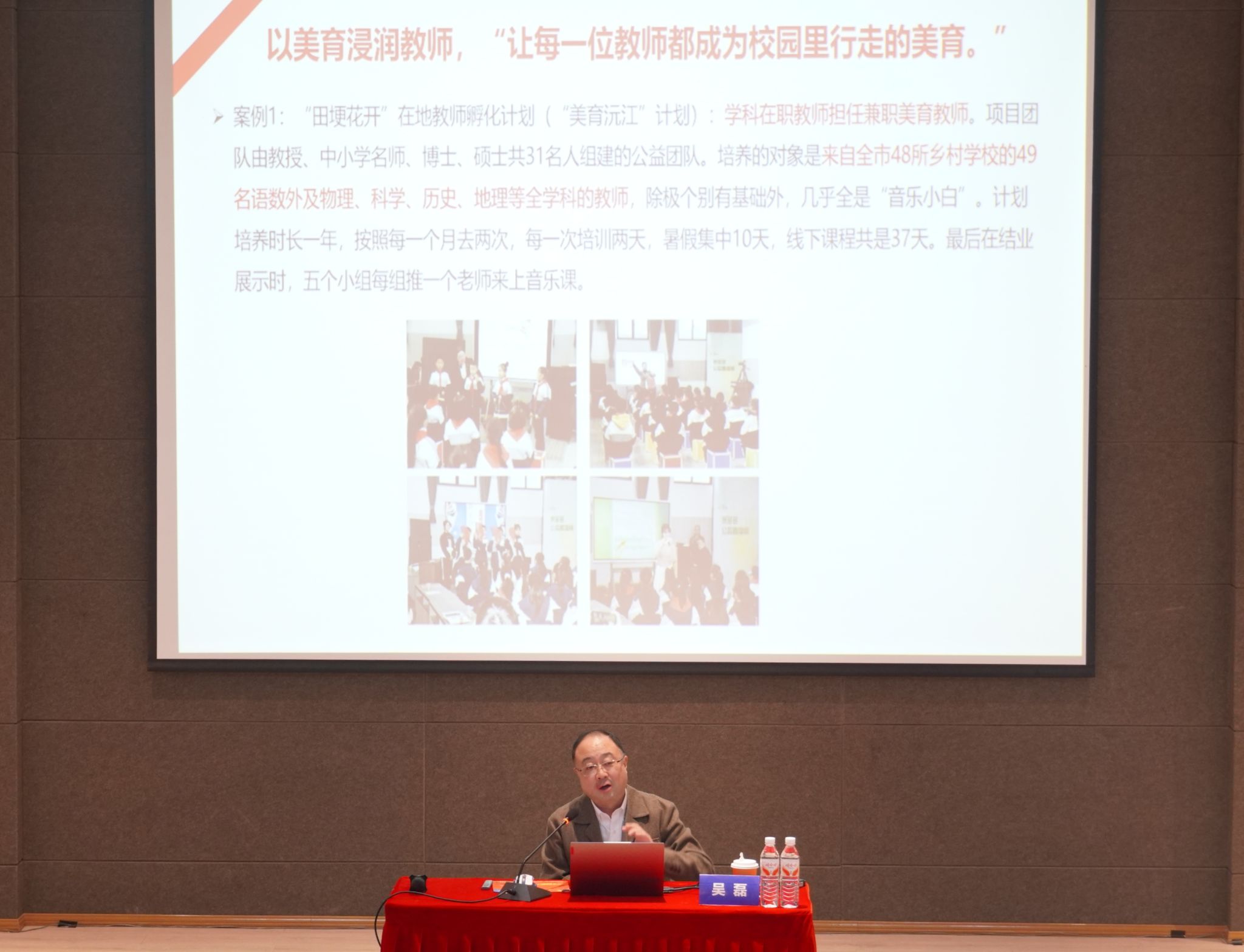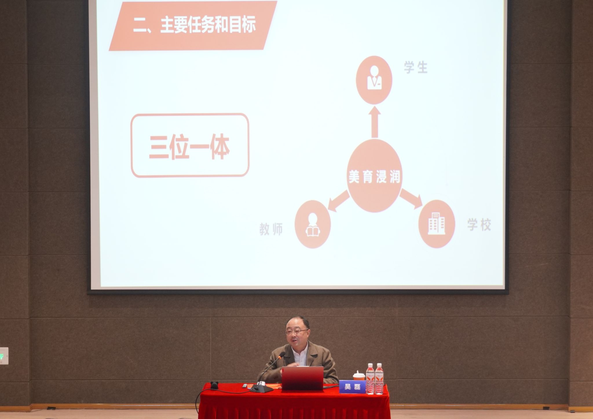 本次培训以“美育浸润行动”为核心主线,吴磊教授首先系统梳理了美育在高校人才培养中的重要定位——作为高校育人工作的关键维度,国家层面已出台多份指导性文件明确相关要求与实施方向。在此基础上,吴教授深入解读了美育政策的核心导向,强调高校需构建覆盖课堂教学、校园文化建设、实践活动开展的全链条美育体系。讲座中,他结合多个高校美育实践案例,分享了具体推进路径:在现有课程体系中有机融入美育元素、打造兼具审美价值与育人功能的校园文化场景、联动校外优质资源拓展美育实践平台等,为以美育助力学生全面发展提供了切实可行的实践指引。