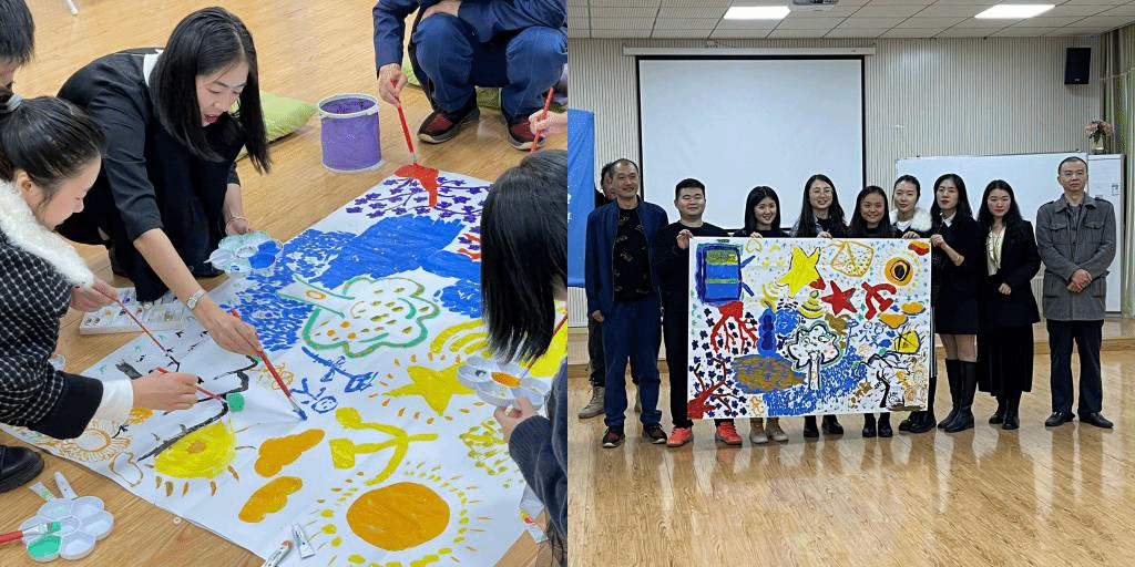 第二个环节,以“画解压力”为主题的小游戏,每个老师任选一种颜色,共同在纸上画下心中所想的物体。过程中老师们脸上露出了不同的表情,有的轻皱眉头,有的面带微笑,还有的表情严肃,随着音乐的旋律老师们共同完成了一幅画。在此环节老师们都神采奕奕,游戏不仅缓解了老师们的压力,也增进了整个团队的相互信任感。