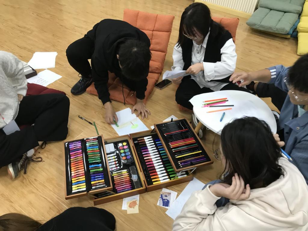 第二个环节是“绘画”,每位成员抽取一张图卡摆放在A4纸上任意位置,发挥想象力用画笔补充图牌周围的画面,再与小组成员分享自己的画作,讲述画中的故事。通过深深浅浅的笔触和五颜六色的线条,构筑与潜意识的链接,释放心灵上的压力。