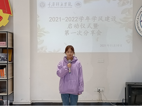 2021年11月19日,2021-2022学年学风建设启动仪式暨第一次分享会在天渠阅览室如期举行,外国语学院2019级的陈艳同学围绕“勤学苦练,力争上游”这一主题和同学们分享经历。