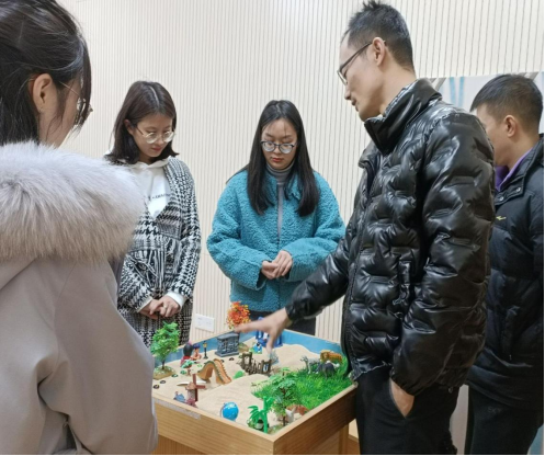 第二个环节是“沙盘体验”,老师们分成5-8人一组,讨论确定小组主题后,依次根据主题拿好沙具摆放到沙盘,经过三轮,最终形成一幅完整的沙盘画。整个过程中老师们满怀好奇,积极参与。大数据与软件学院辅导员、兼职心理咨询师李婷老师根据物品摆放的方向、状态、种类以及摆放过程中的行为动作进行讲解分析,让老师们不断发出惊叹的声音!