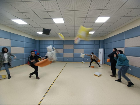 第三个环节是“枕头大战”,规则是老师们分为两只队伍,在一首歌的时间里,互相往对方区域扔枕头,最后根据各系区域内的枕头数量判断输赢。在枕头大战的过程中老师们沉浸其中、玩得不亦乐乎并且让老师们在短时间内释放压力、放松心情。