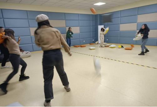 第三个环节是枕头大战,老师们分成两队,在一首歌的时间互相扔枕头,宣泄情绪,释放压力。整个过程中,老师们放飞自我、乐此不疲,并一致认为枕头大战确能起到解压和放松的作用。