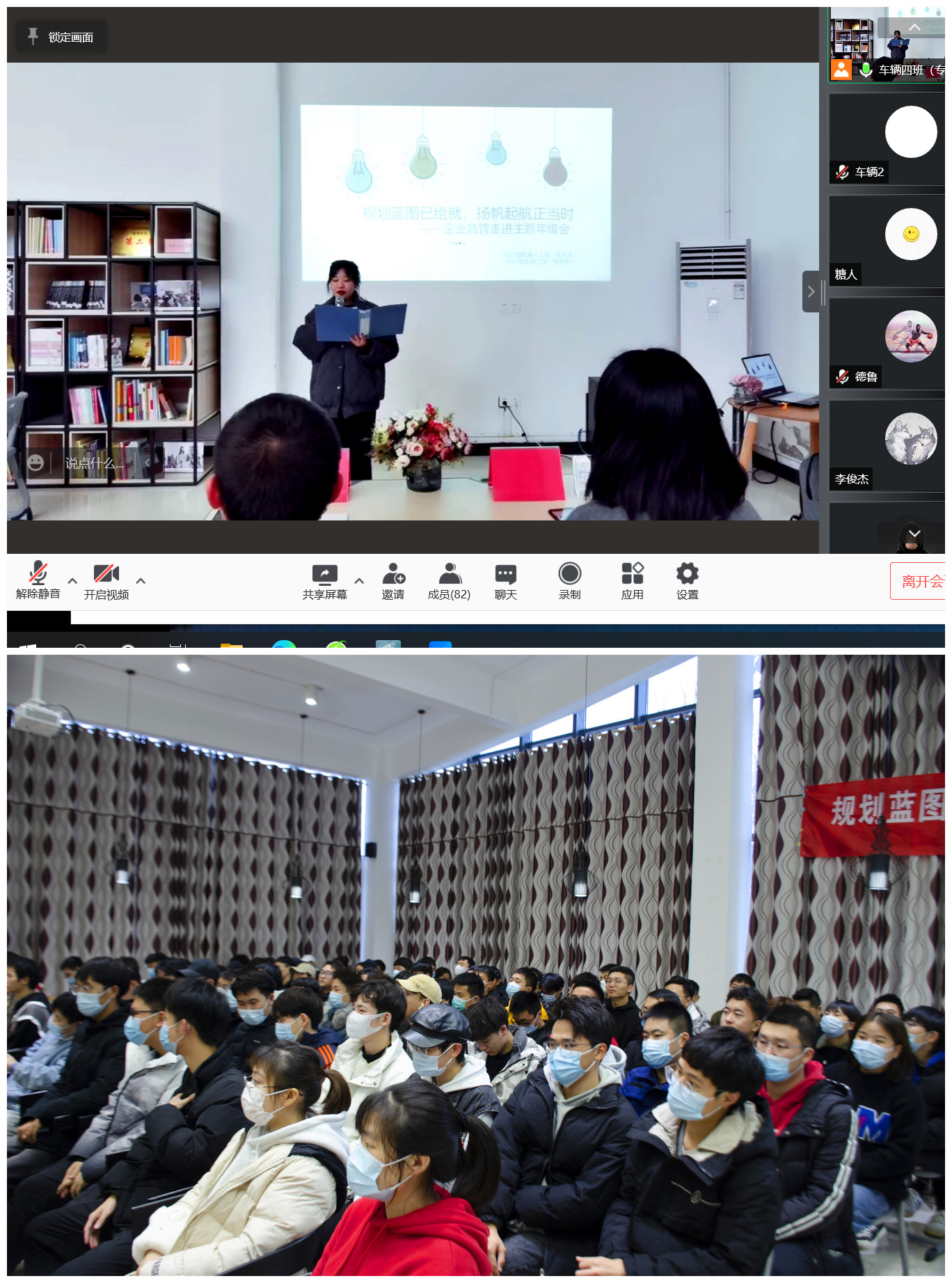 本次年级会的嘉宾有重庆智能机器人研究院教育培训部部长、重庆华数机器人有限公司教育事业部总经理黄学彬先生,智能工程学院辅导员吴家家老师。2021级机器人工程(专升本)1班的高嘉敏同学担任主持人,2021级机器人工程(专升本)1、2班,车辆工程(专升本)4班全体同学到场。由于疫情防控要求,2021级车辆工程(专升本)1到3班,轨道交通信号与控制(专升本)1到6班,2019级电气工程及其自动化1到6班共500余人同步观看线上直播。