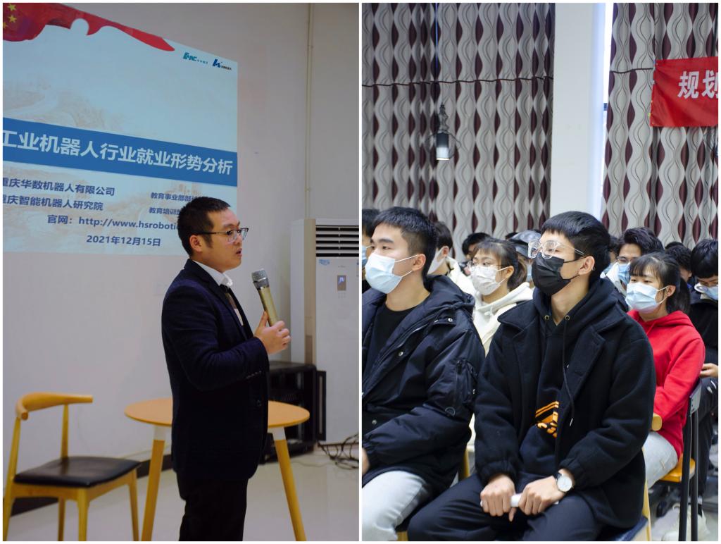 黄学彬总经理强调智能制造是推进制造强国战略的主攻方向,他为同学们介绍了智能生产与智能产线,用具体实例说明现在工业机器人的市场需求巨大,并详细为同学们普及初级人才、中级人才、高级人才所应具备哪些技能,机器人行业人才发展路径等。随后,现场同学提问,黄学彬总经理也热情回应,比如车辆行业与机器人行业的融通性,同学们择业时要打开格局,大工科范围内的工作都可考虑,多给自己一些机会。吴家家老师也代表线上观看的同学向黄学彬总经理提问:“华数机器人来我校招聘时想要什么样的人才?需要同学们具备哪些技能?”黄学彬总经理回答道:“首先是态度要端正,在校期间要好好掌握专业技能,利用假期积极参与社会实践,多多累积项目经验。”