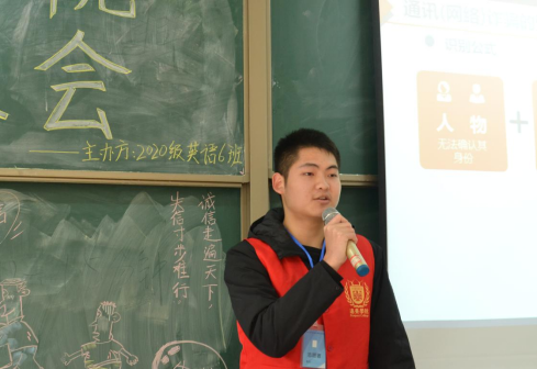 最后,2020级辅导员阳果老师对本次大会做了总结,阳老师希望同学们在期末考试中能诚信参考,遵守考试规则,同时阳老师自己在生活中遇到关于“诚信”的小故事,让诚信二字更加深入人心。