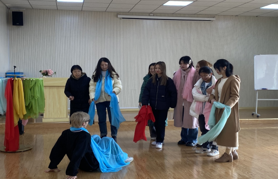 培训第二项内容——热身活动“Do you love me”,谭永红老师要求各位围成小圈,由一位成员站在圆圈中间向另一位成员提问;“Do you love me?”当被问到的成员回答“yes”时,回答者两边的成员需绕圈跑一周回到空位,后到的成员则成为新的提问者。当被问到的成员回答“no”时,则需要指定一位成员,使被指定的成员两边的人需要重复以上操作。