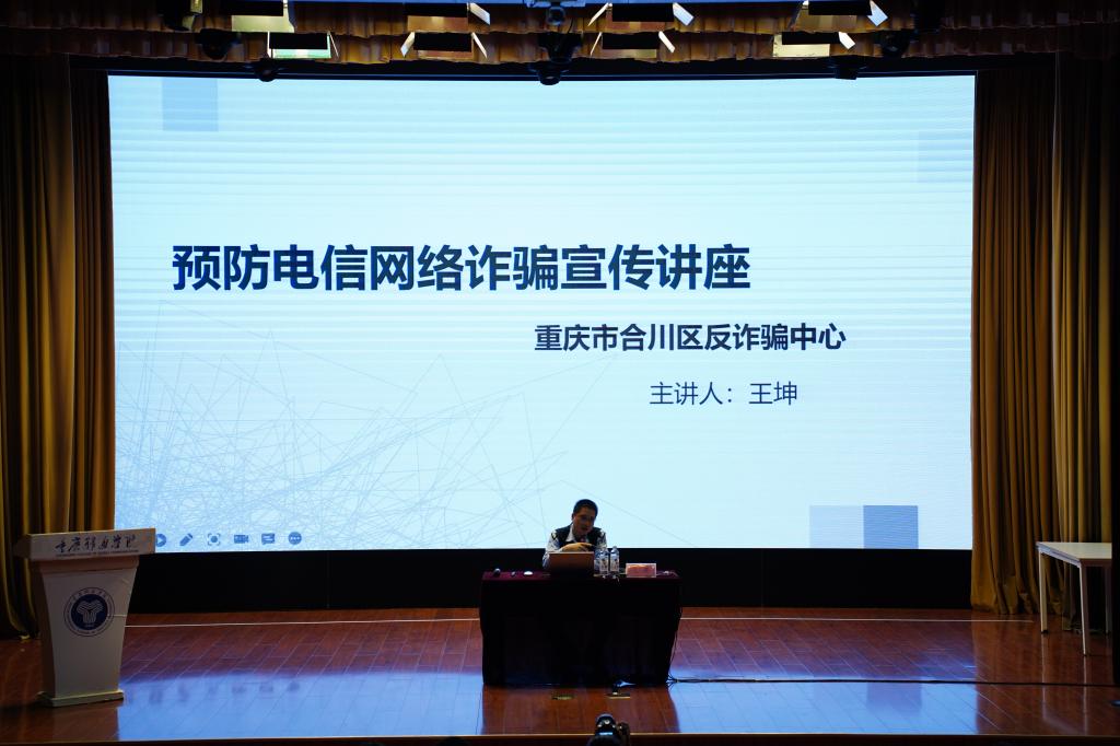 最后反诈骗中心王坤警官对与会师生进行了全面且细致的反诈技能培训,王警官提到从学校建立“猫头鹰”反诈骗志愿服务支队以来,学校的诈骗案卷确实有所减少,合川区周边几所高校也先后模仿建立了相关支队开展反诈宣传,“猫头鹰”反诈支队做出了表率。其次王警官通过分析合川区高校近两年来的诈骗发案率、发案金额以及发案类型对比引入本次培训内容,主要从电信网络诈骗的特点、手段和预防措施三方面进行了详细讲解,运用合川区各地真实案例进行切入分析,情景交融,让师生学习到了使用的防诈骗知识,同时也切实感受到了诈骗的可怕和狡诈。