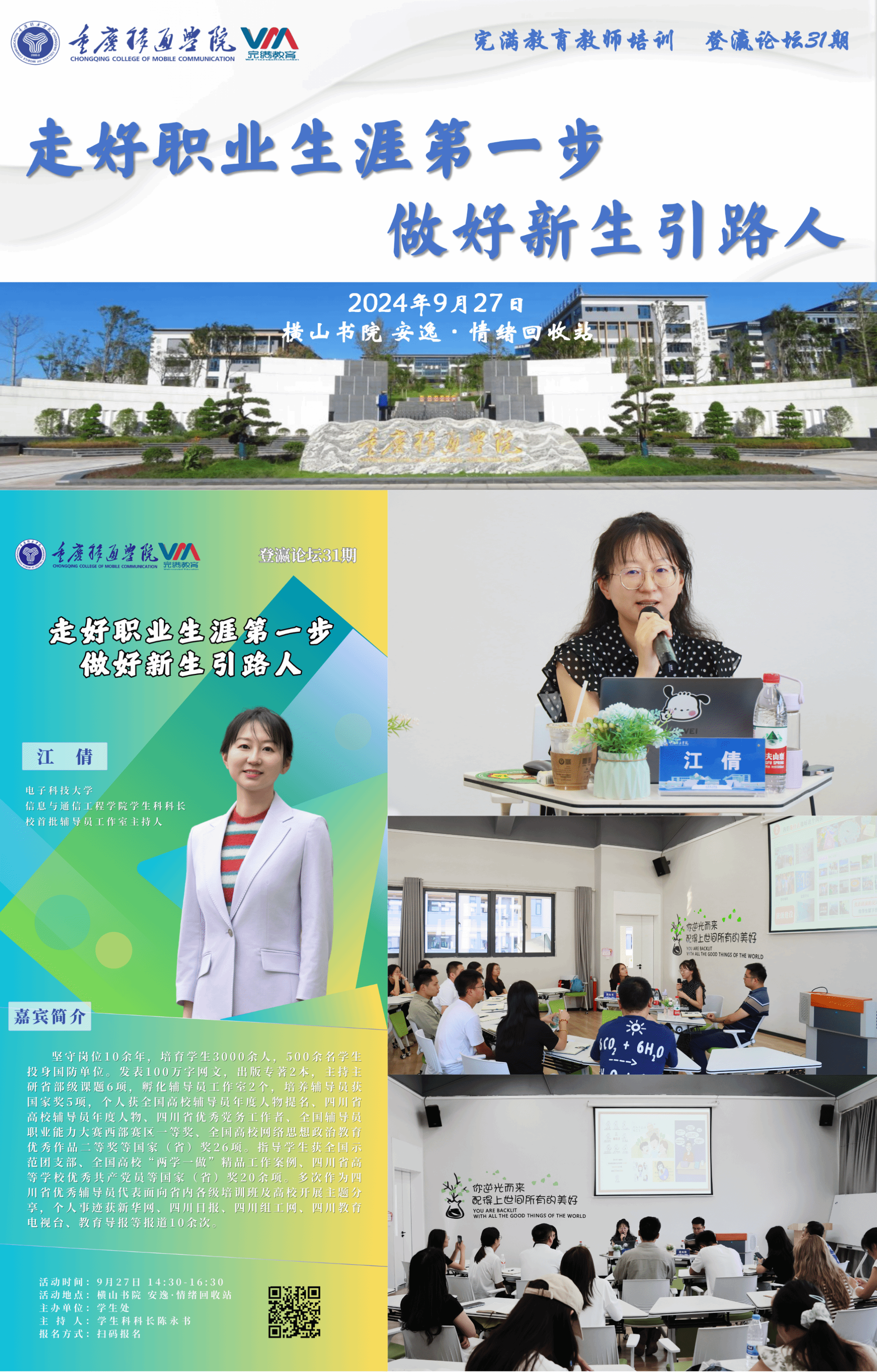 为全面提升学校思政工作质量,深化落实立德树人根本任务,帮助新辅导员老师找好职业定位,扣好职业生涯的“第一粒扣子”,不断提升辅导员队伍的政治素养、业务能力及育人水平,努力成为学生的知心朋友和人生导师。9月27日下午14:30,学生处特邀请电子科技大学江倩老师在横山书院安逸·情绪回收站开展第31期登瀛论坛“走好职业生涯第一步 做好新生引路人”专题讲座,学生处副处长唐尚静及30余名辅导员到场参与,培训由学生科科长陈永书主持。